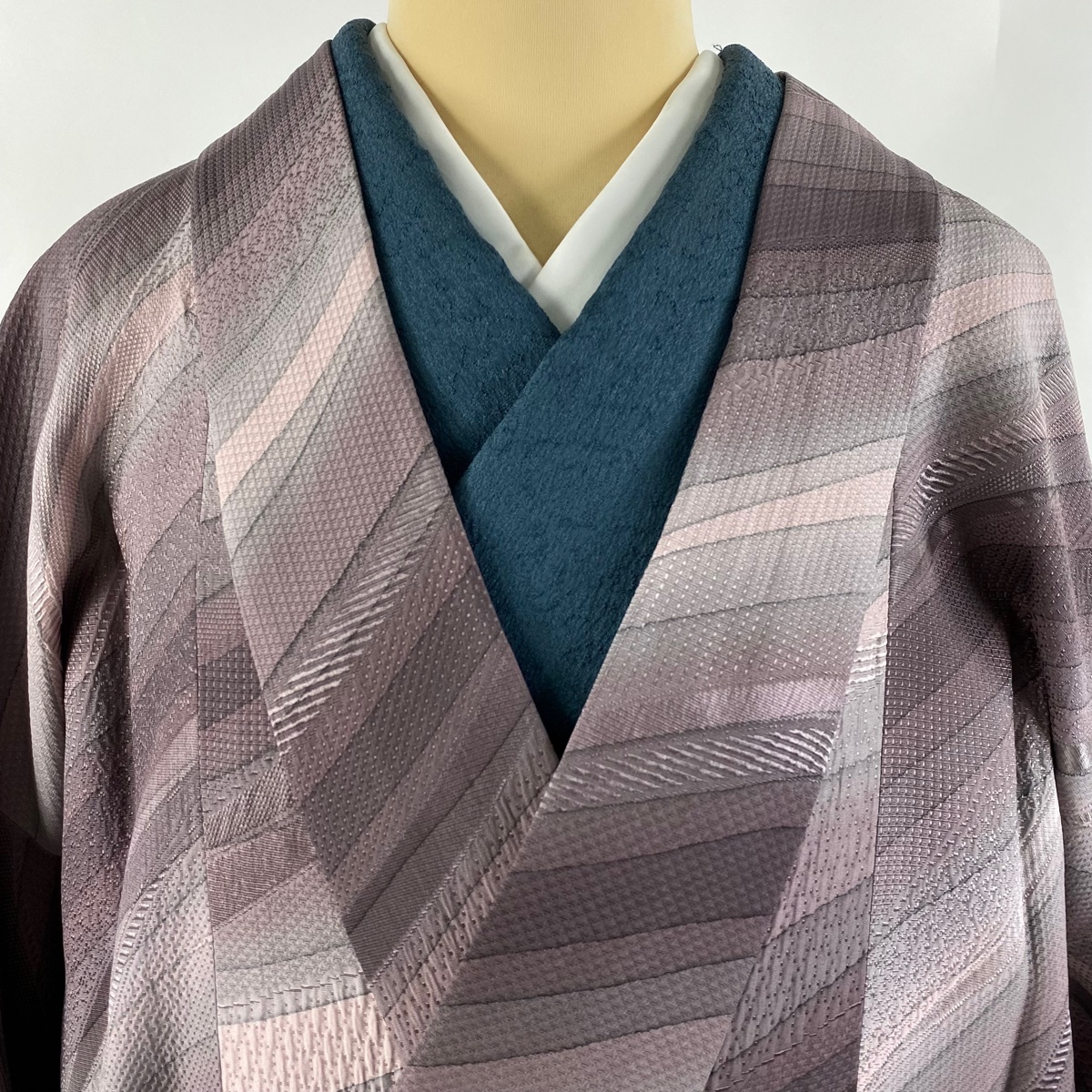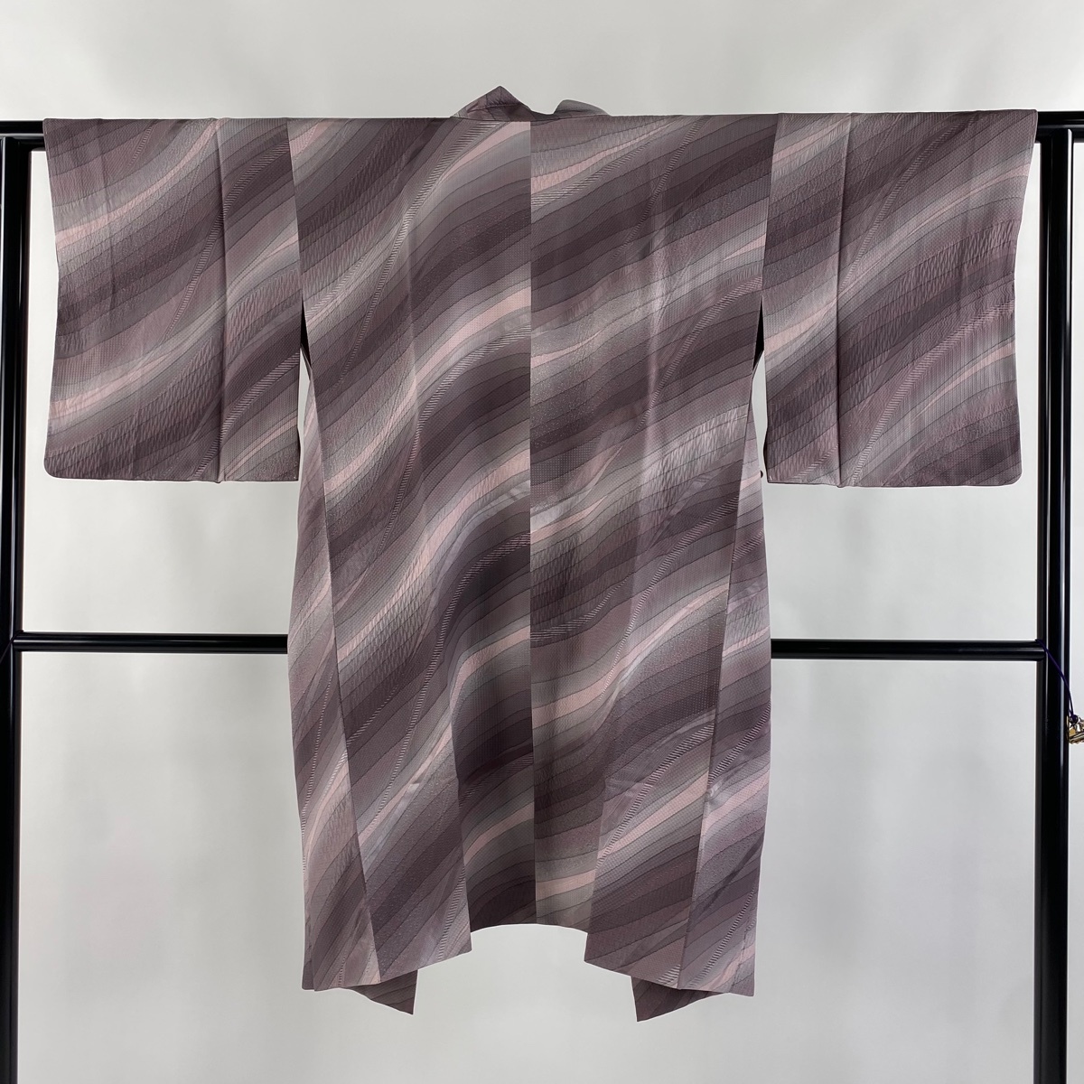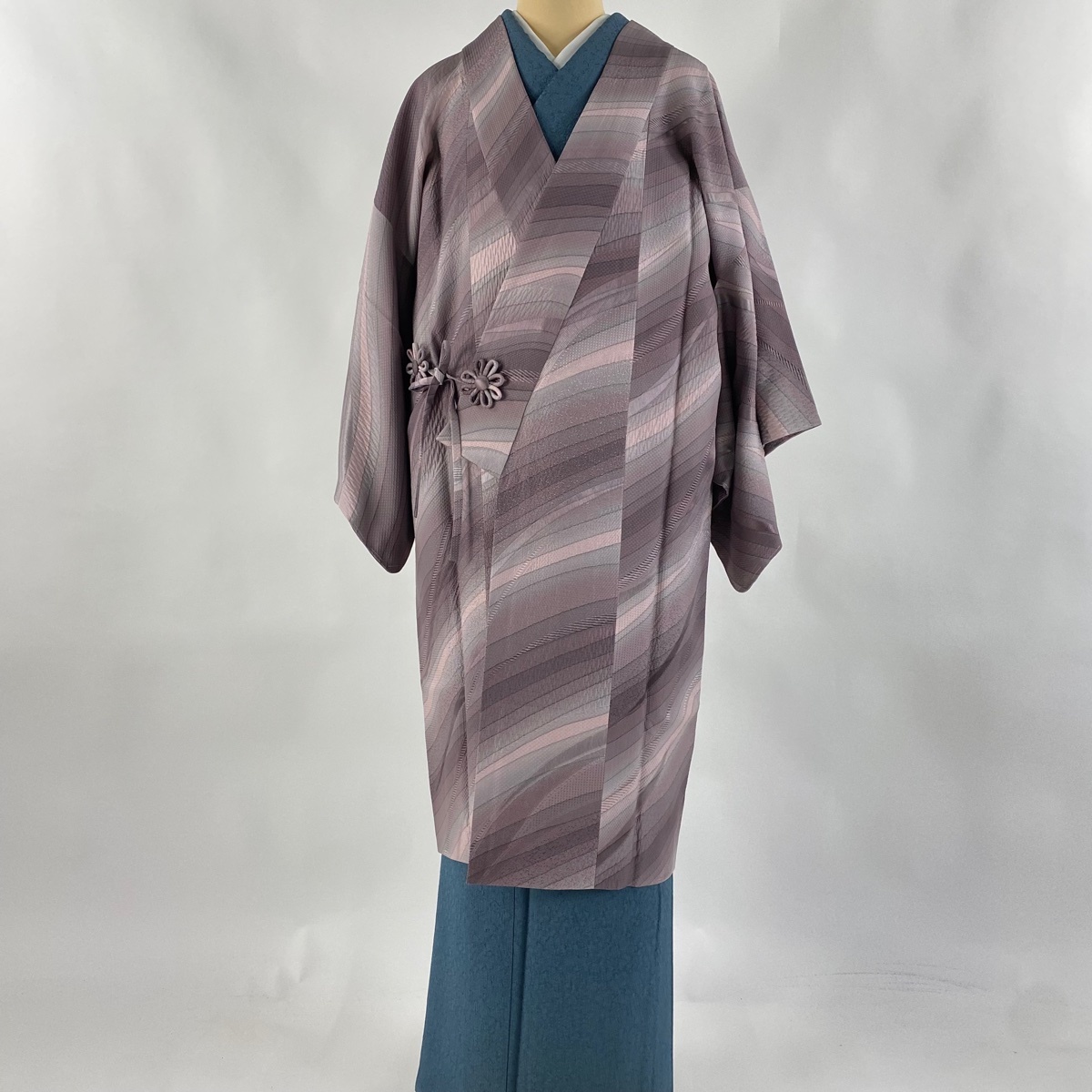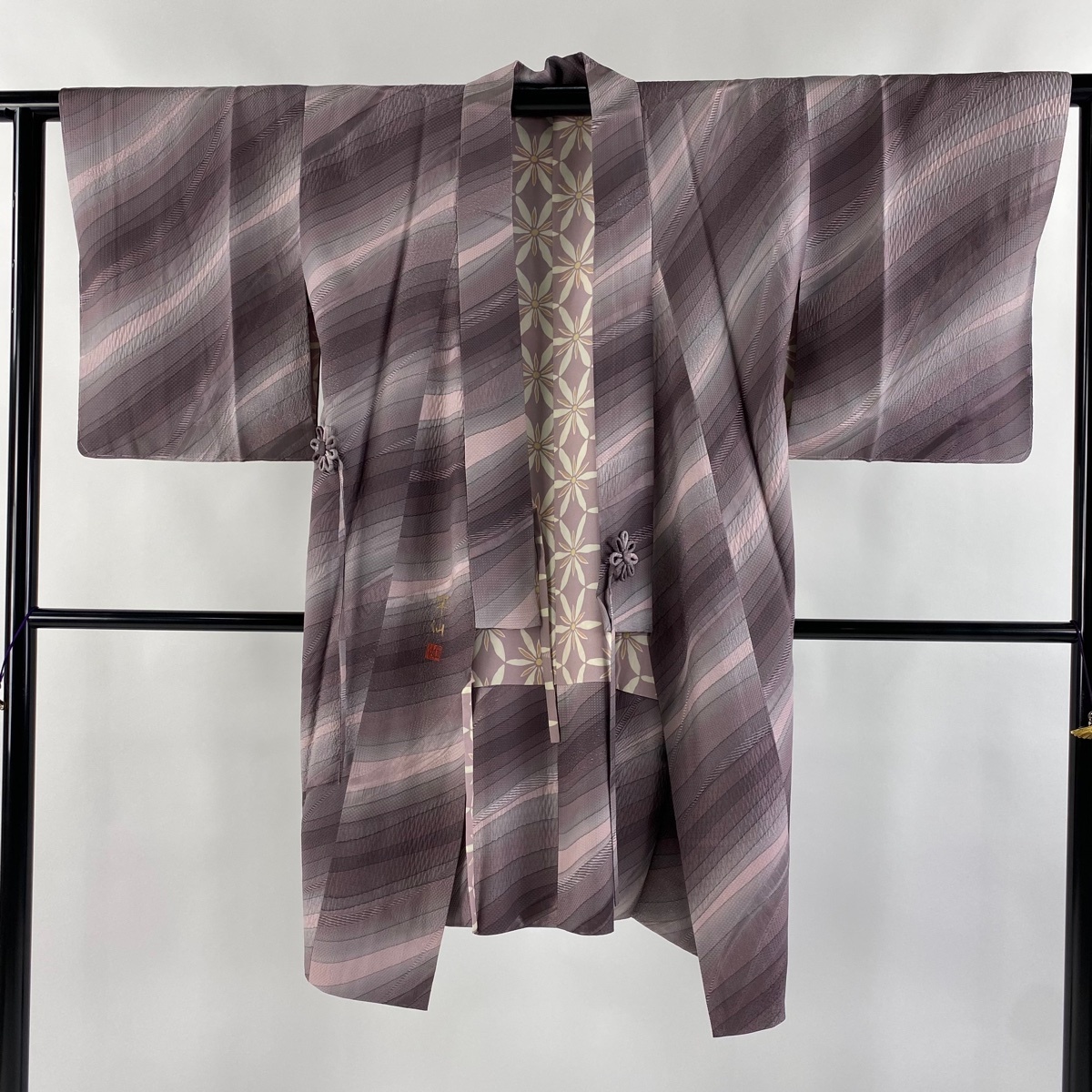 | 道中着 美品 逸品 落款 和装コート 着物衿 斜縞 地紋 ぼかし 紫 身丈105.5 裄丈61 S 正絹 【中古】 |
