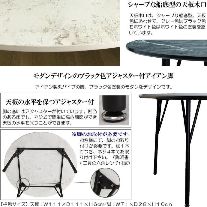 | 【商品特徴】 | ◇2人~4人が掛けることができる直径105cm円型天板です。 ・天板表面材に、高級感漂う大理石柄のメラミン化粧板を使用。熱や擦り傷に強く、飲み物を零してもサッと拭くことができてお手入れも簡単です。 ・天板裏面にも表面材と共柄のメラミンを使用しています。 ・天板木口は、シャープな船底型。ブラック色の塗装を施しています。 ・アイアン製丸パイプの脚。ブラック色塗装のモダンなデザインです。 ・脚の底にはアジャスターが付いています。凹凸のある床でも、ネジ式で簡単に高さ調節ができ、天板の水平を保つことができます。 ・ディスプレイテーブルとしてもご利用できて、重量約15.5kgの軽量タイプです。 ・お客様にて、脚のお取り付けが必要となっております。(脚1本につき、ネジ4本でお取り付け下さい。(説明書・工具の六角レンチを付属。) |