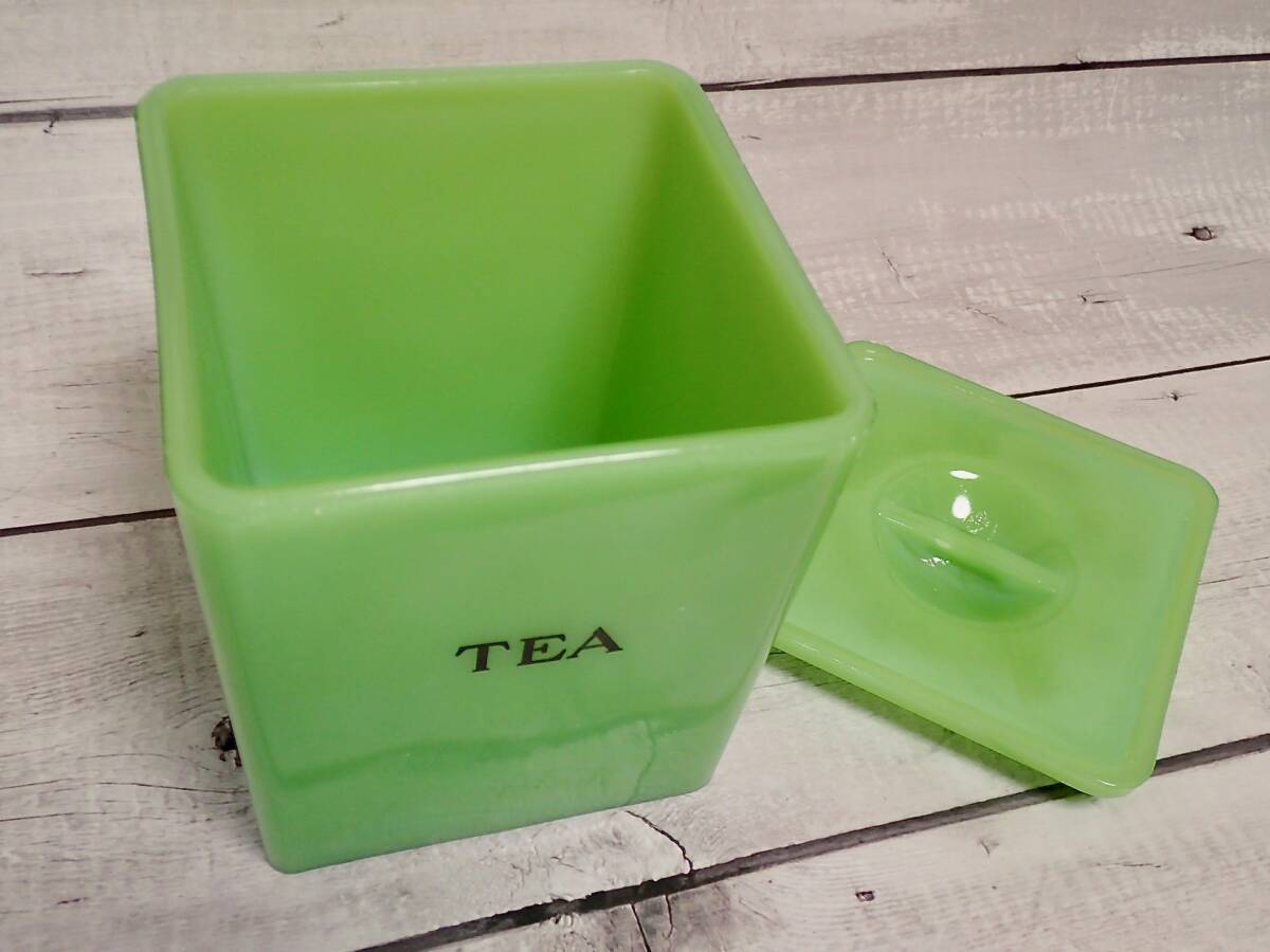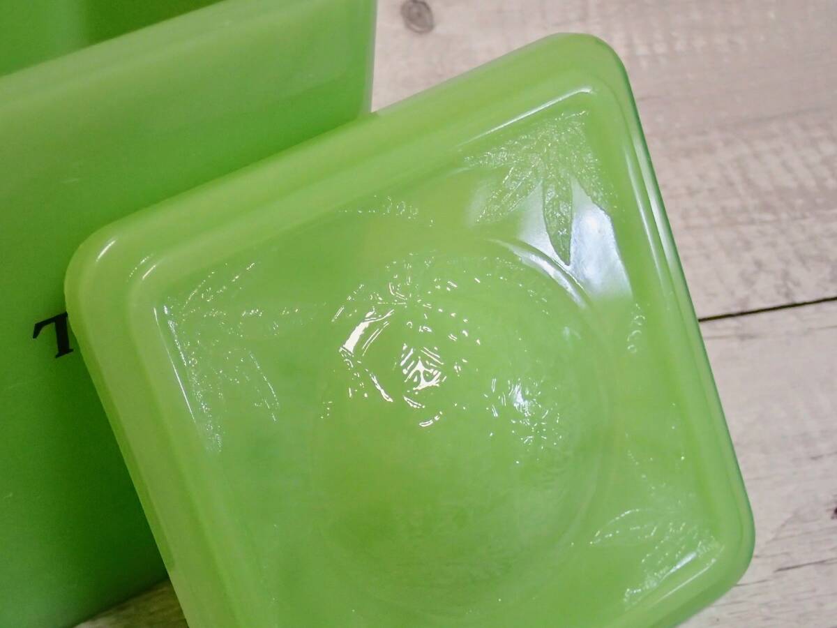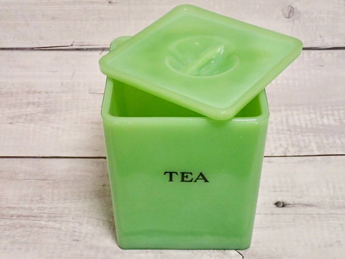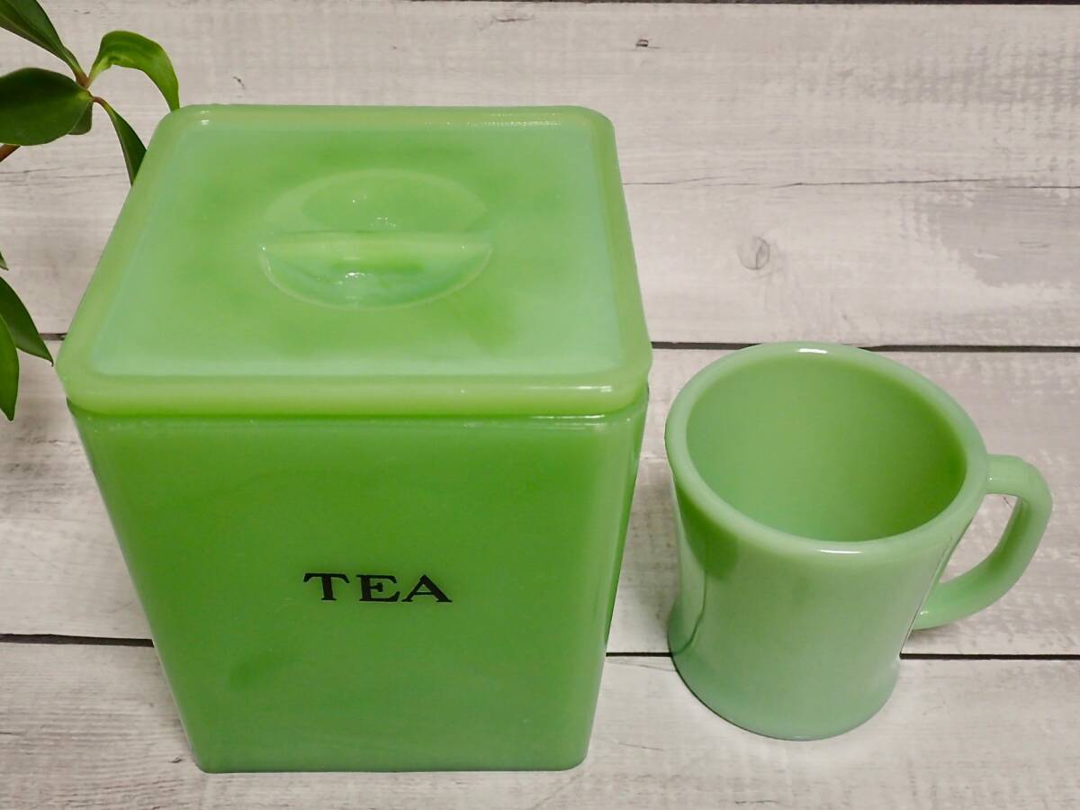 ジャネット製のビンテージ・キャニスターです。COFFEESUGARCEREALFLOWERとこのTEAがあります。フタ付きです。フタの裏側に隠れて花模様のレリーフがあるというたいへんオシャレな品です。サイズは縦/横125mmで高さ150mmほどとなります。この29オンスの他に48オンスという大きなサイズもあったようです(Dハンドルマグはサイズ比較用で出品には含まれません)。ジャネット社のミルクガラスは色が薄いもの・濃いものがあり出品物は濃い目のほうのようでとても鮮やかなジェイドカラーです。このデザインのキャニスターはスクエアでシンプルなデザインなので使い勝手も良いのですが、リッドのフチのエッジが立っているところがありその部分が欠けやすいという難があります。出品物にも目立ちませんがほんの極小の欠けが見られますが幸いにも大きなダメージには至っていません。数十年前のヴィンテージとしてはとてもキレイな良品と言って良いかと思います。(私感です)。