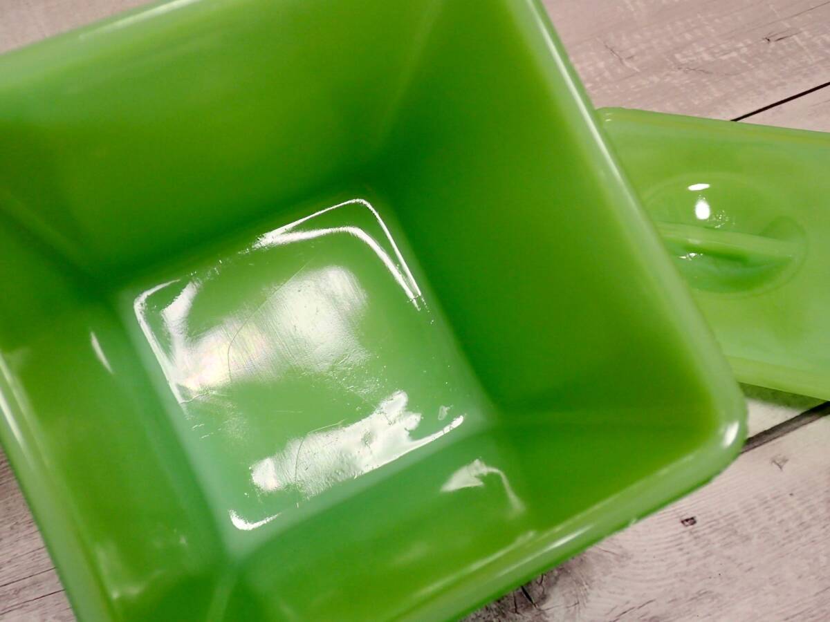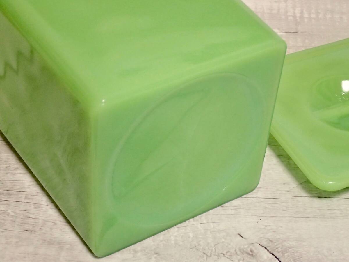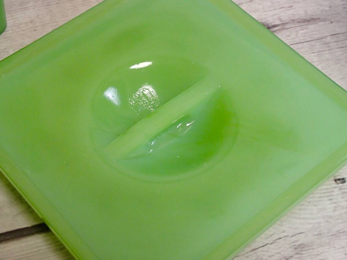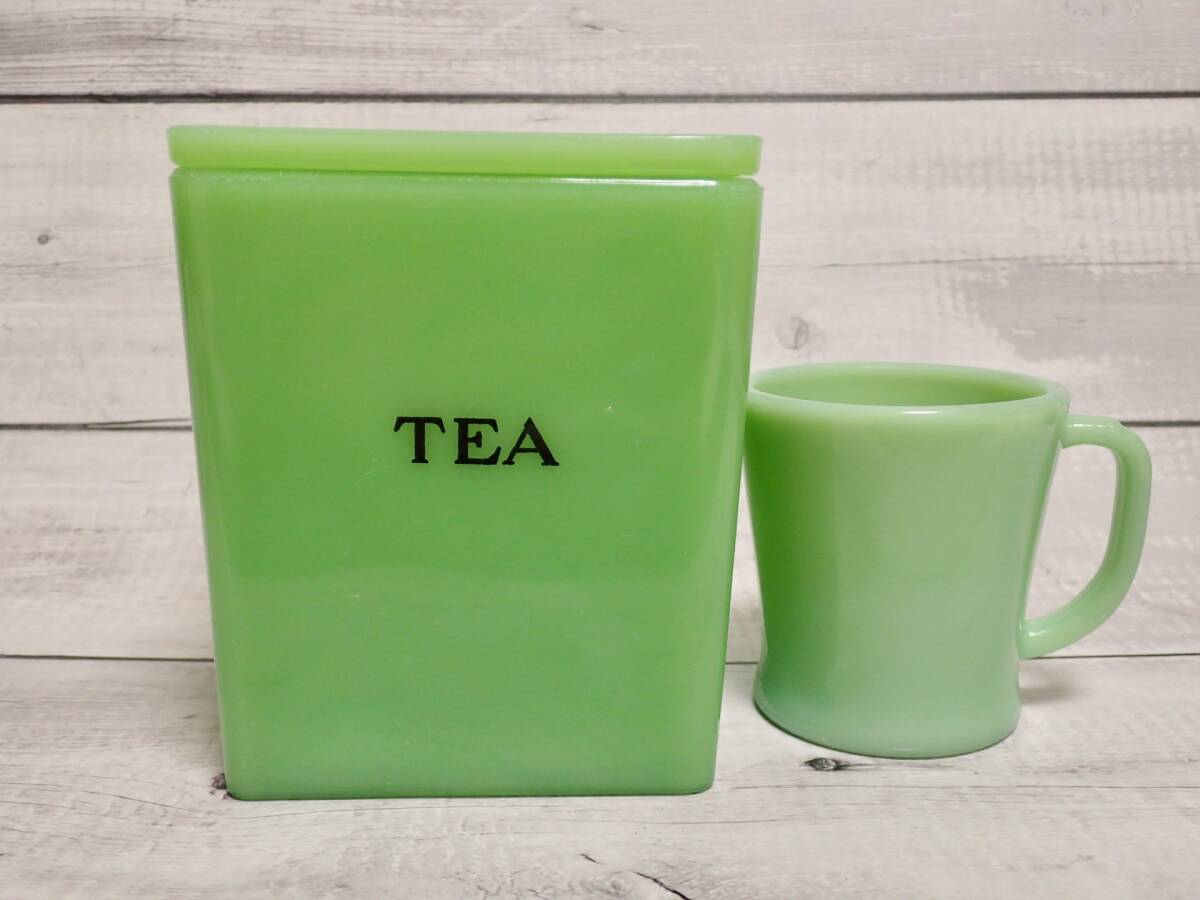 ジャネット製のビンテージ・キャニスターです。COFFEESUGARCEREALFLOWERとこのTEAがあります。フタ付きです。フタの裏側に隠れて花模様のレリーフがあるというたいへんオシャレな品です。サイズは縦/横125mmで高さ150mmほどとなります。この29オンスの他に48オンスという大きなサイズもあったようです(Dハンドルマグはサイズ比較用で出品には含まれません)。ジャネット社のミルクガラスは色が薄いもの・濃いものがあり出品物は濃い目のほうのようでとても鮮やかなジェイドカラーです。このデザインのキャニスターはスクエアでシンプルなデザインなので使い勝手も良いのですが、リッドのフチのエッジが立っているところがありその部分が欠けやすいという難があります。出品物にも目立ちませんがほんの極小の欠けが見られますが幸いにも大きなダメージには至っていません。数十年前のヴィンテージとしてはとてもキレイな良品と言って良いかと思います。(私感です)。