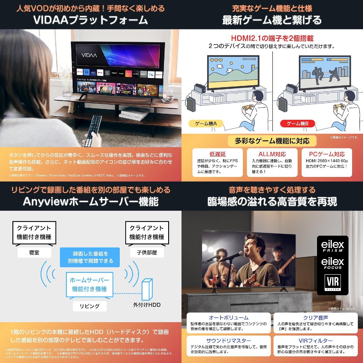 • 【高音質機能】Eilexの技術を採用し、大音量を抑制しながら、聞き取りにくいささやきや呟きを適度に増幅して安定した音量で再生します。映画やドラマの視聴中でも、人の声を優先させ、視聴体験を向上させます。また、デジタル圧縮で失われがちな細かな音も修復し、全体の音質を改善します。