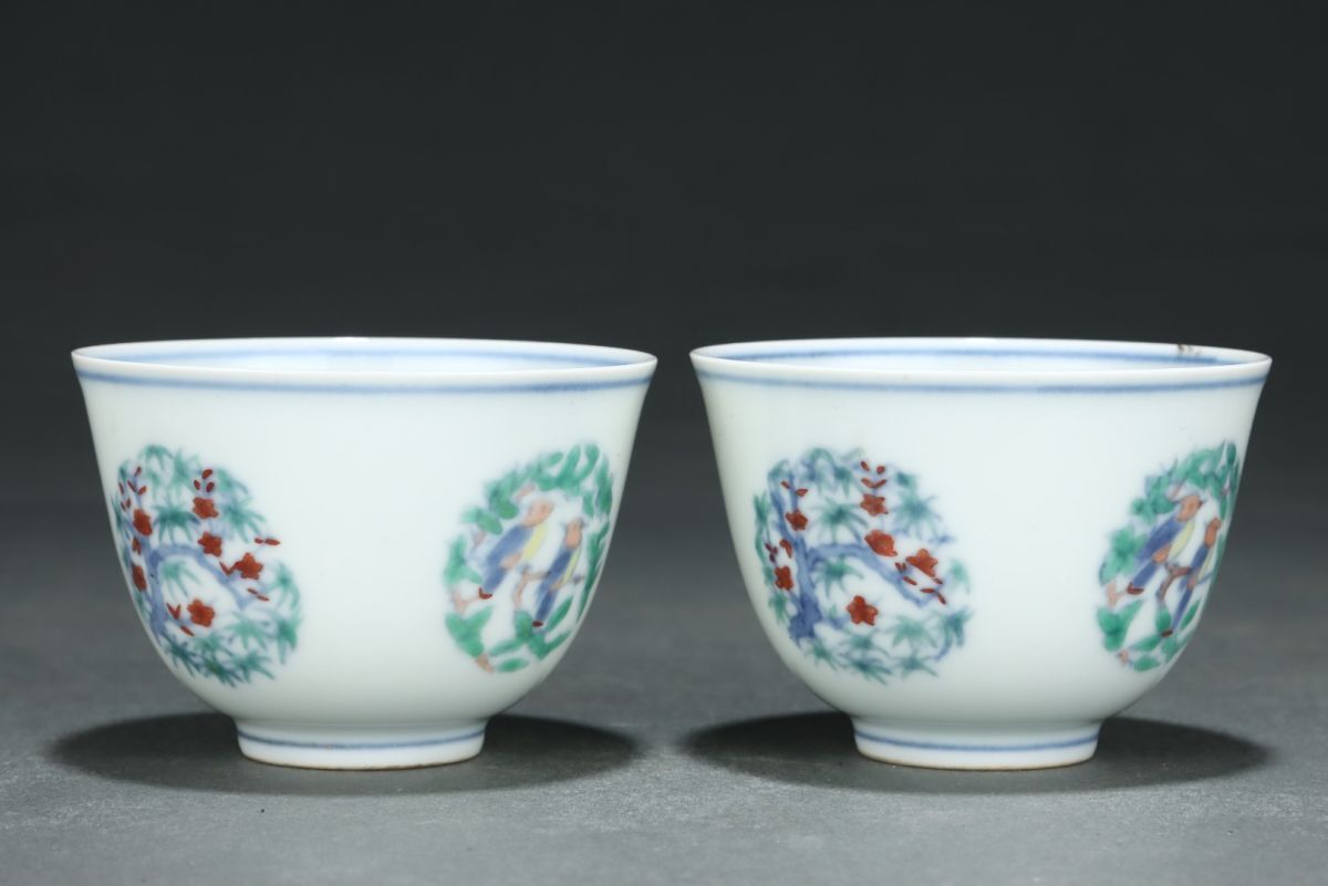 【永】明時代 大明成化年製 斗彩花鳥紋杯 一対 古陶磁器 陶芸 皿 中国陶瓷器 唐瓷 置物擺件 古美術品 古賞物 収集 旧家蔵出 中国唐物 A576