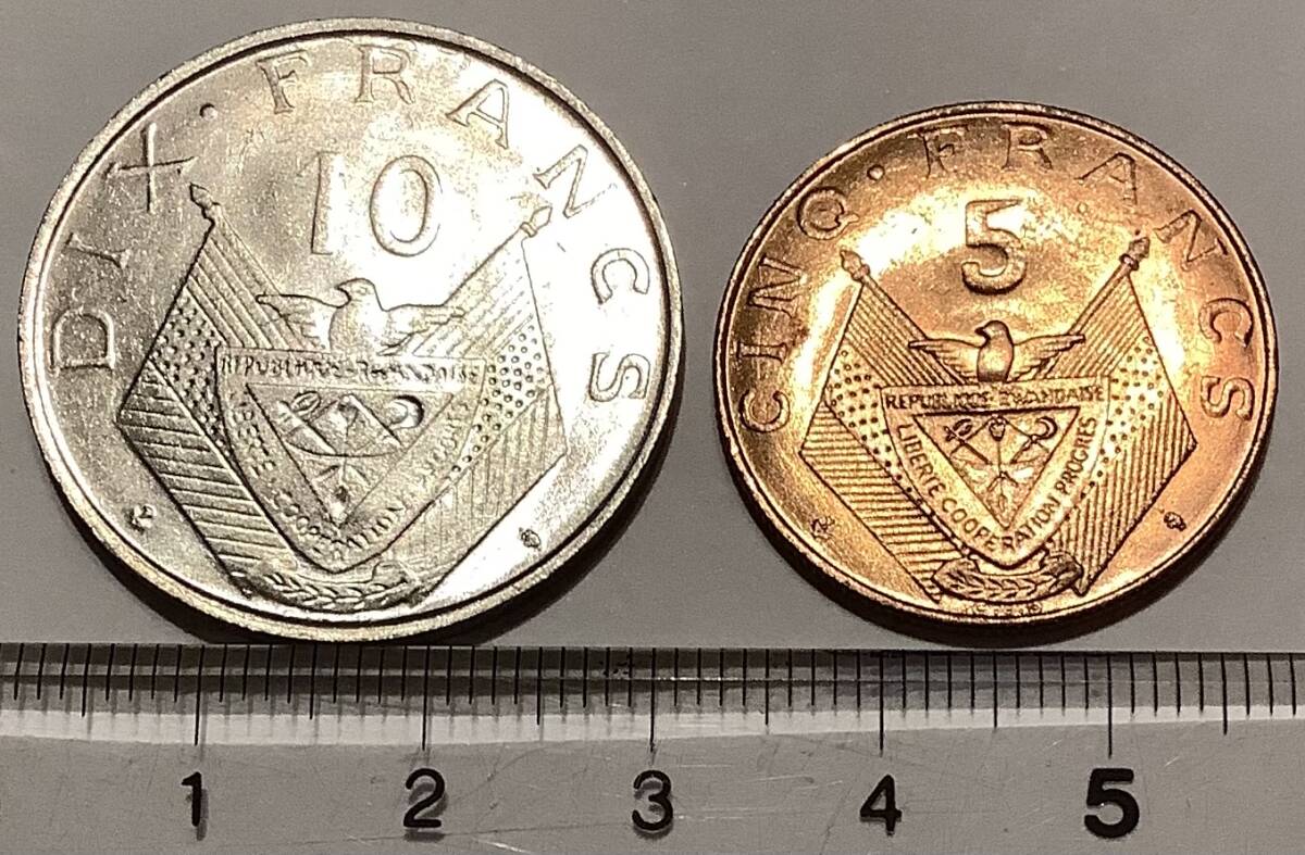 ルワンダが1962年に独立してから、1964年に発行された10フランと5フラン硬貨2種セット、未使用。