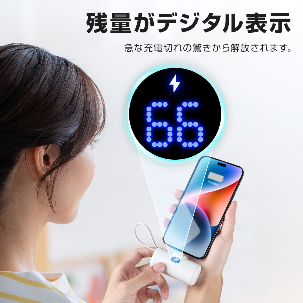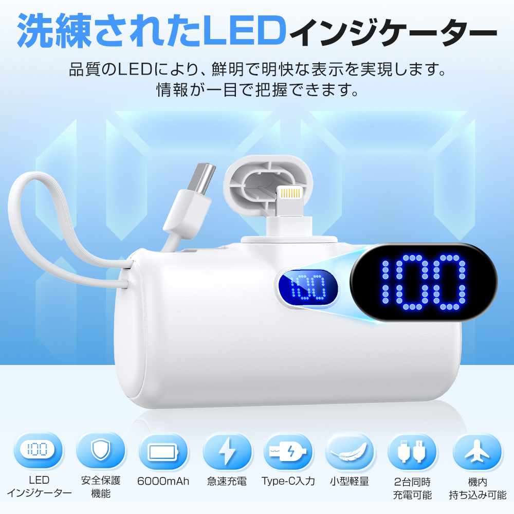 モバイルバッテリー 小型 6000mAh 大容量 2.1A急速充電 2台同時充電 ケーブル内蔵 ピンク