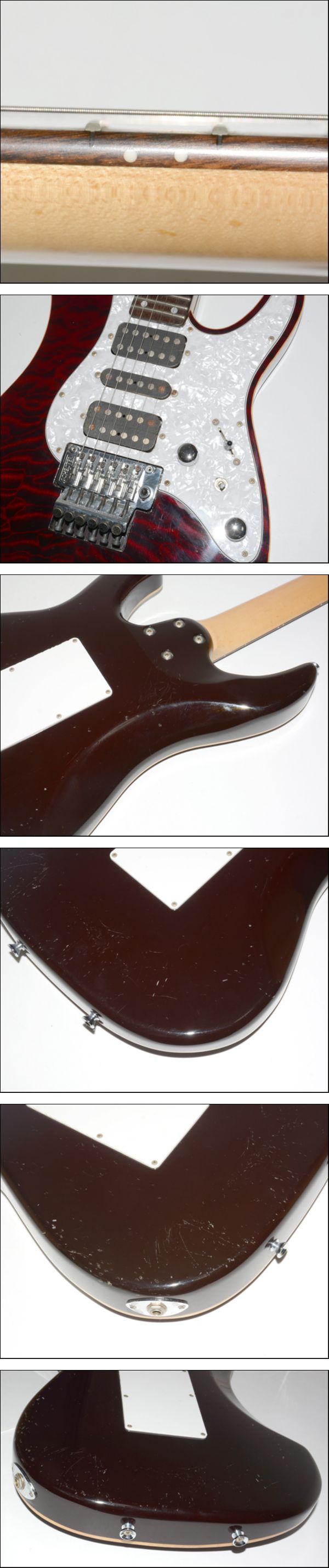 ・ボディ正面にスレ、キズが見られます。 ・ボディ側面、背面にスレ、キズ、打痕が見られます。 ・ボディ底面にスレ、小キズが見られます。 ・ネックに多少のスレ、キズ、打痕が見られます。 ・ネックジョイントに僅かな塗装クラックが見られます。 ・ヘッドに多少のスレ、キズ、打痕、僅かな欠けが見られます。 ・指板に多少のスレ・打痕、小キズが見られます。 ・バインディングに多少のスレ、キズ、打痕、塗装クラックが見られます。 ・ペグ・ブリッジ・ピックアップ等金属部分に多少のスレ、小キズ、くすみ、サビ等が見られます。 ・ピックガードにスレ、キズが見られます。 ・ピックアップにスレ、小キズが見られます。 ・ノブに多少のスレ、キズが見られます。 ・スイッチに多少のスレ、小キズが見られます。 ・ネジにサビ、腐食が見られます。 ・バックプレートにスレ、キズ、打痕、削れが見られます。 ・ケースにスレ、キズ、汚れ、ほつれ等が見られます。 全体的にスレ、キズ、打痕、サビ等が見られますが、 上記の点以外に特に目立ったキズ、ダメージは見られません。 ネックはほぼストレートの状態です。 (現在の弦高は12Fで、1弦側:約1.5mm 6弦側:約1.5mm) 重量:約3.6kg、ナット幅:約41mm、スケール: 約648mm |