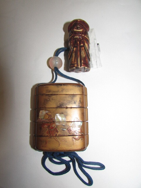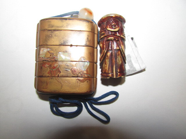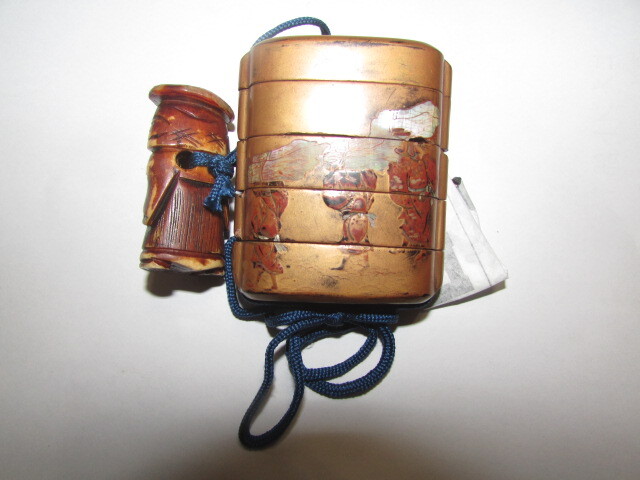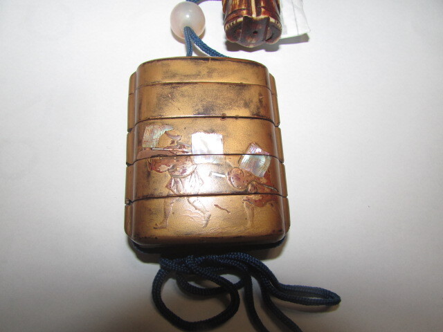 (会津若松・旧家・蔵出し)江戸時代 ( 古い味わいのある螺鈿入り蒔絵印籠・・何か担ぐ人物と大原女か模様 )貴重・珍品