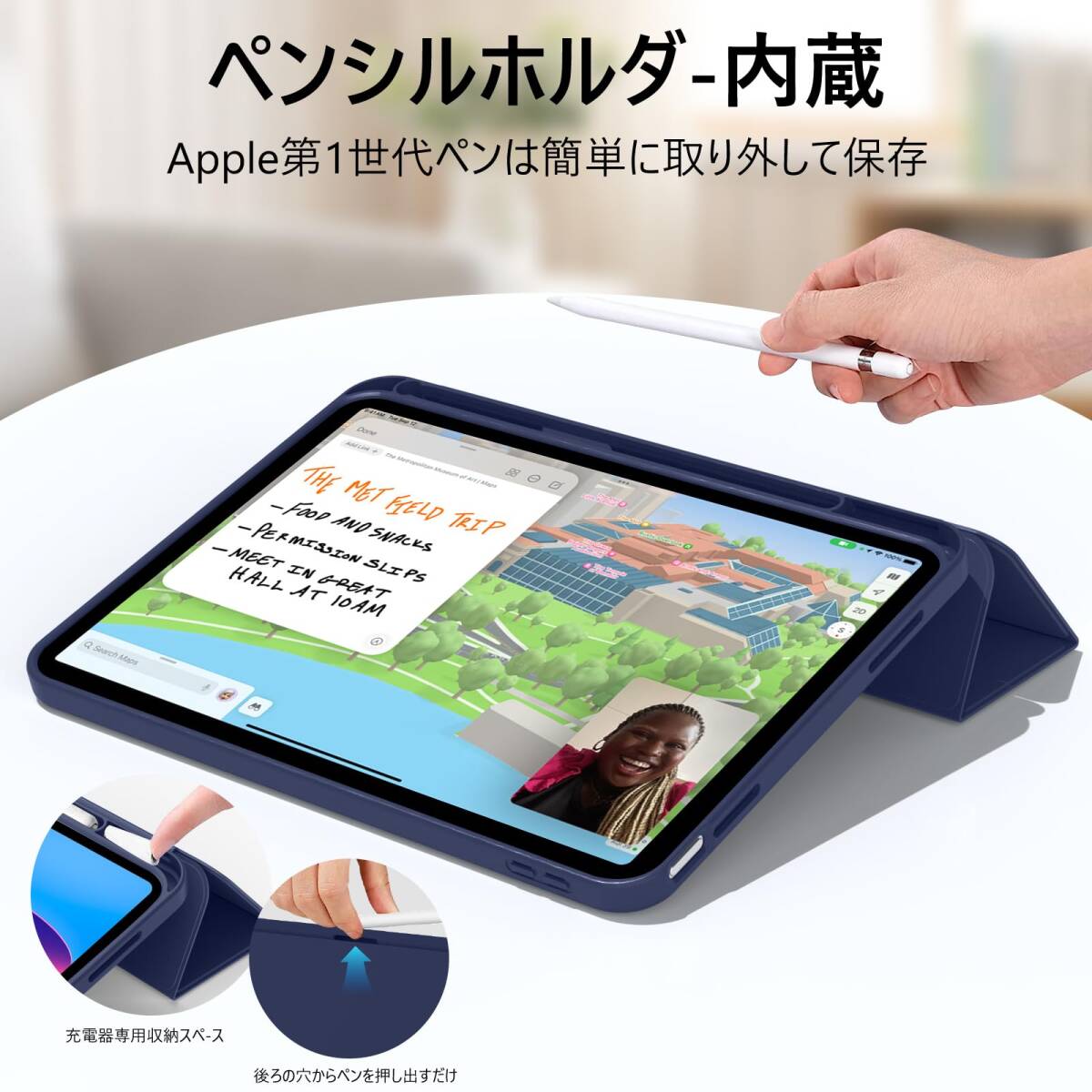 【便利なペン収納】Apple Pencilペン収納、便利なペンホルダーが付き、収納や持ち運びに便利です、ペンシル取り出し用の穴があるので簡単にペンを取り出す事ができます。いつでもどこでもiPadを快適に使えます。 アップルペンシル と 付属品 の紛失を防止して、安心して持ち運ぶ事ができます。
