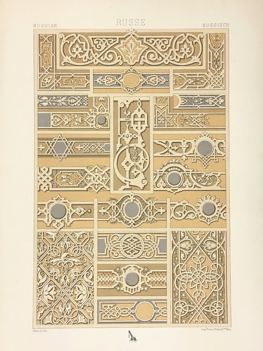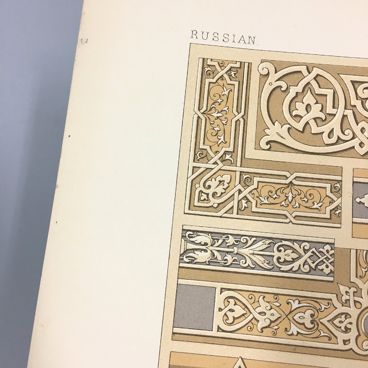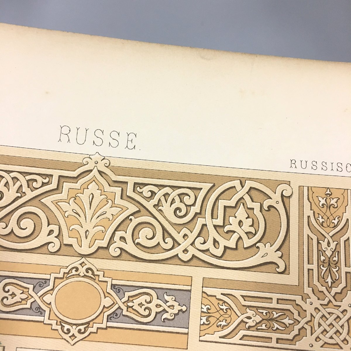 多色刷石版画『RUSSE ロシア 装飾 結び目他』 解説付 オーギュスト・ラシネ L’ornement Polychrom 1888年 建築 デザイン 博物画