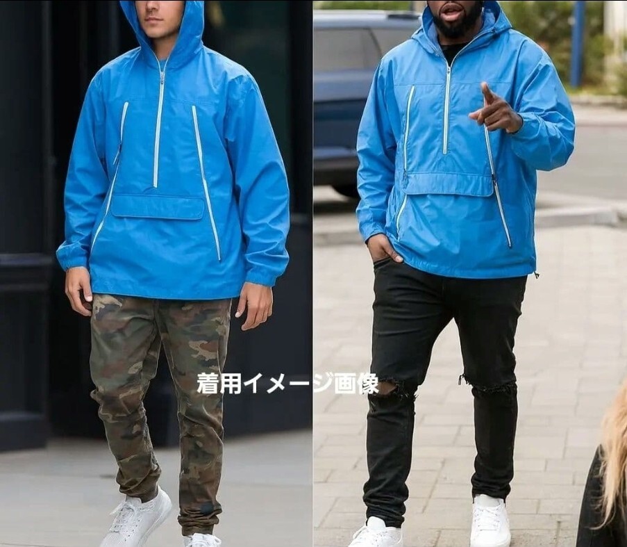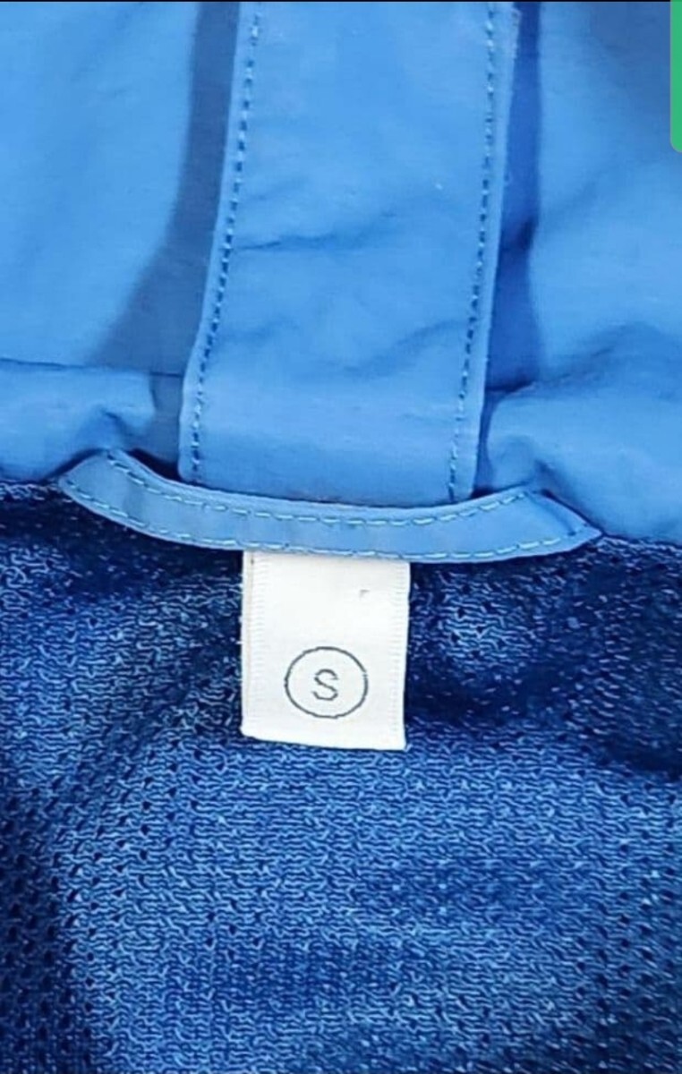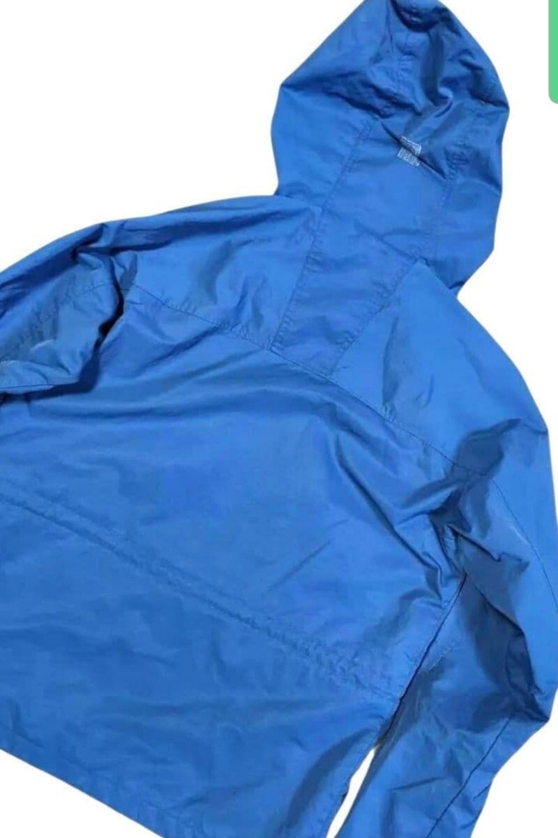 鮮やかなブルーが映える一着で、軽量ながらしっかりしたナイロン素材。