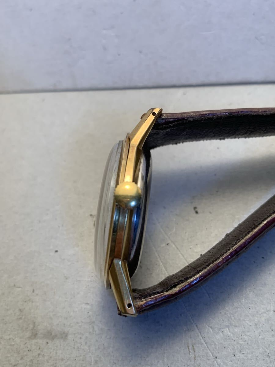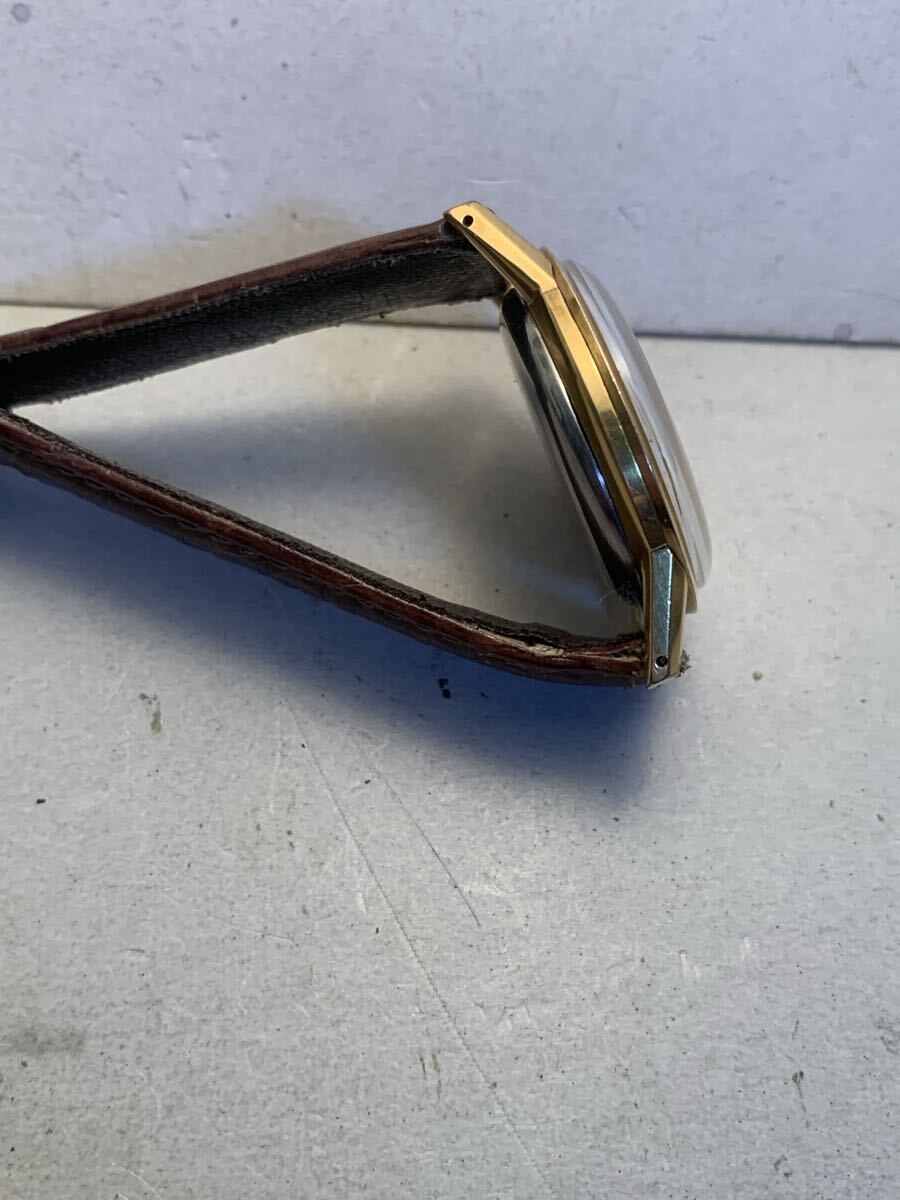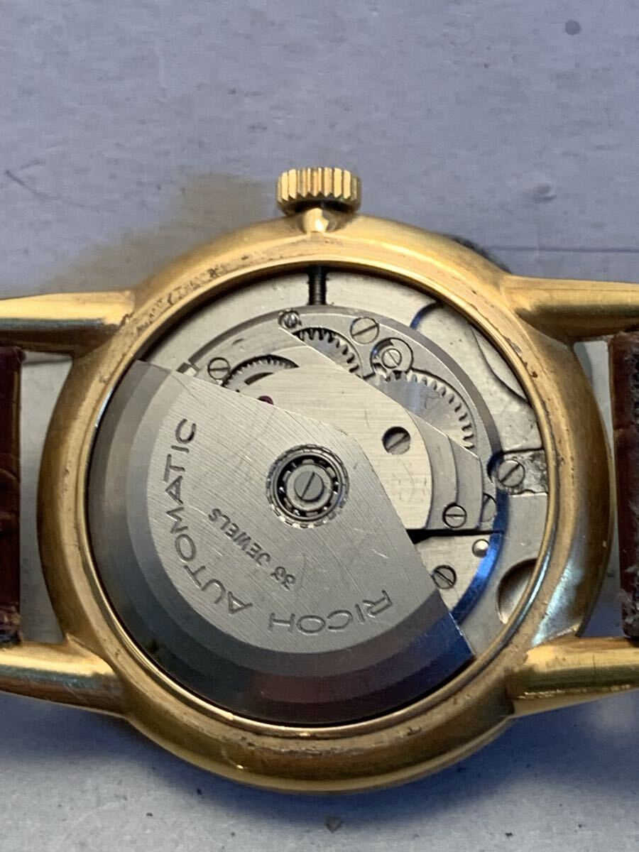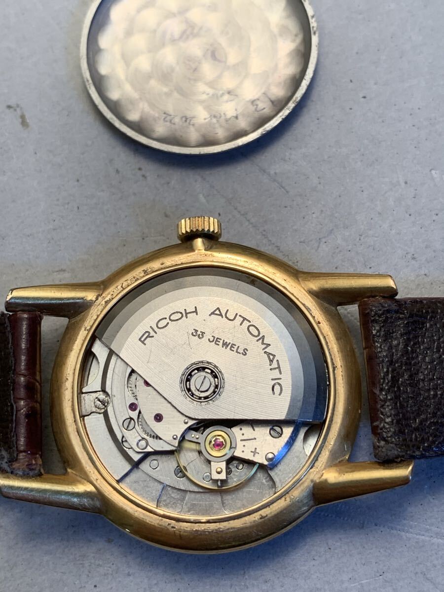 金メッキケースにステンレス製裏蓋、ベゼル外径は約36.5ミリ、ラグ幅は約18ミリです。文字盤には傷や汚れがありますが、ケースには大きな傷はありません、ラグの角部分に少しメッキの剥がれている箇所があります。ムーブメントはRICOH33石自動巻きムーブメントです。カレンダーの早送りは時針の21時から24時に動かすことで、1日ずつカレンダー送りができます。