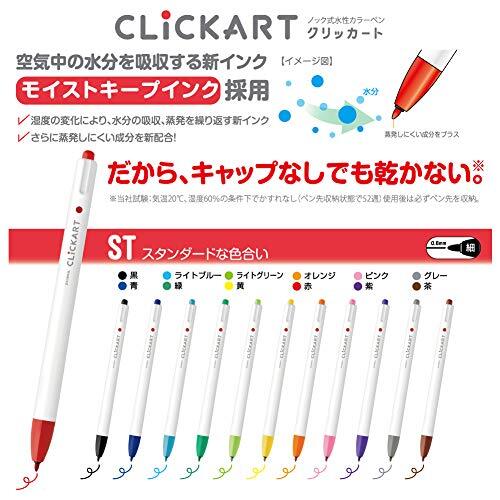 ゼブラのノック式水性カラーペン、「クリッカート」。 クリッカートは「キャップない」・「乾かない」・「色キレイ」がセールスポイントです。 これまでのカラーペンの使用における不満な点は、、、 (1)キャップを閉める時に誤って手にインクがついてしまう。 (2)キャップの開け閉めが面倒。 (3)キャップを閉め忘れるとペン先が乾いてしまう。 これらの不満を、クリッカートは「キャップない」・「乾かない」・「色キレイ」の3大メリットで払拭致します! クリッカートは全36色ございます。