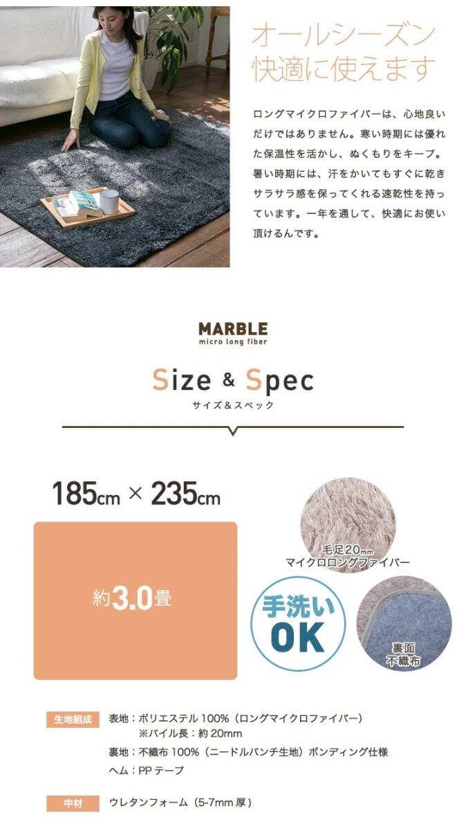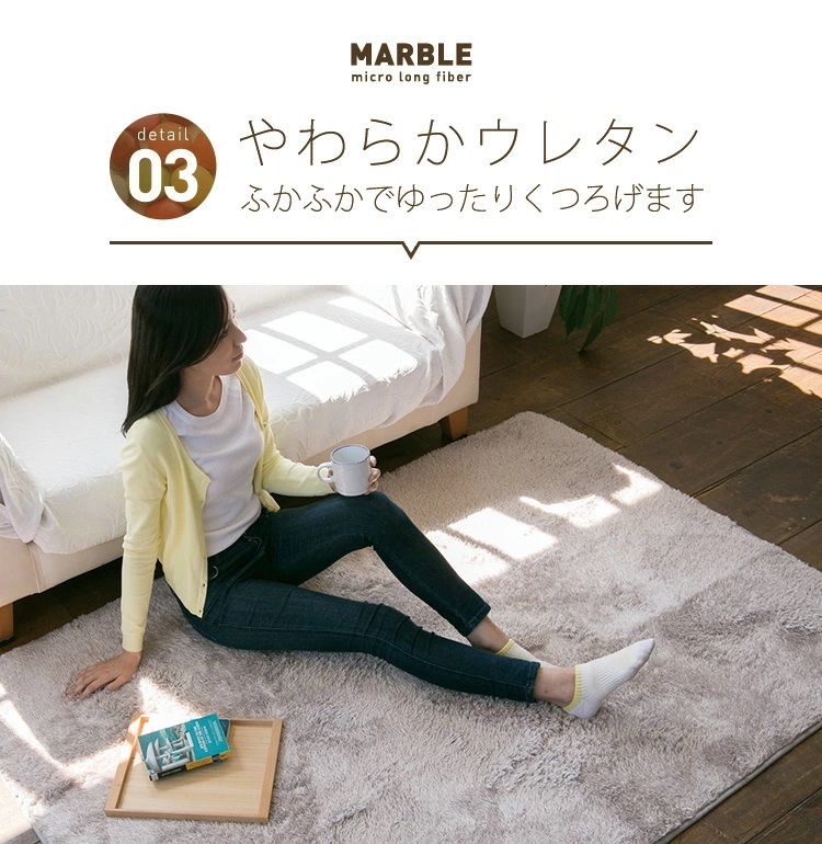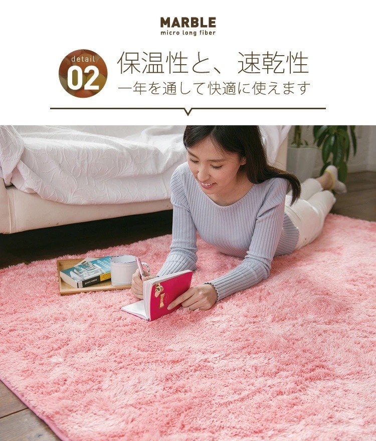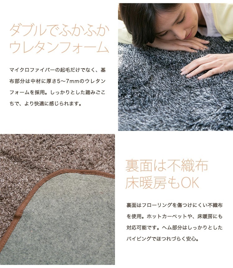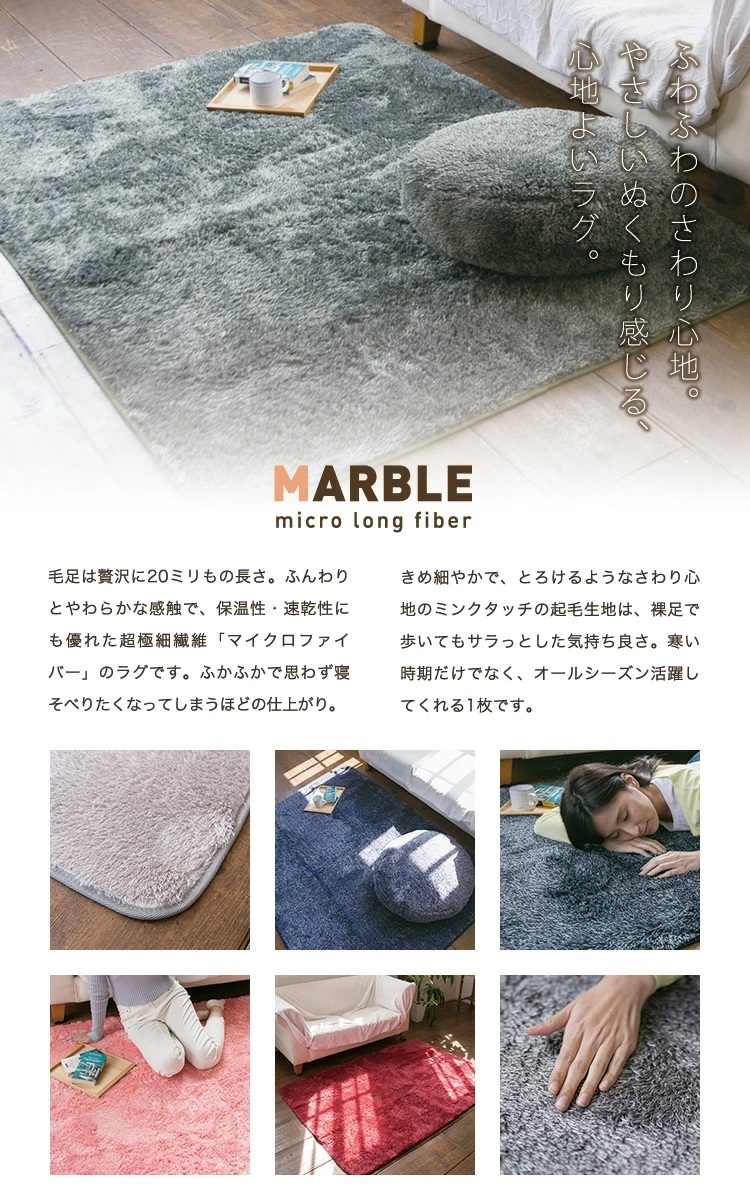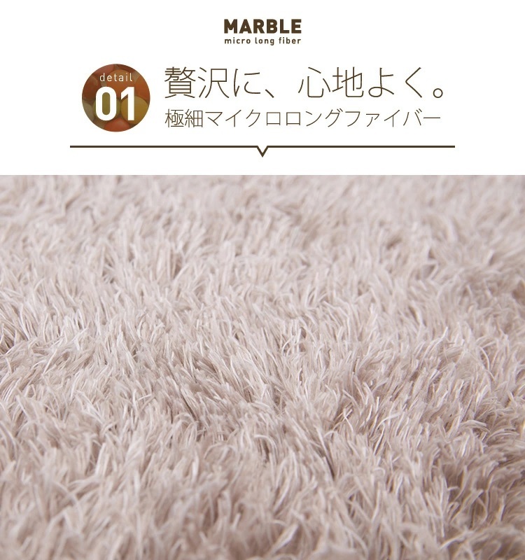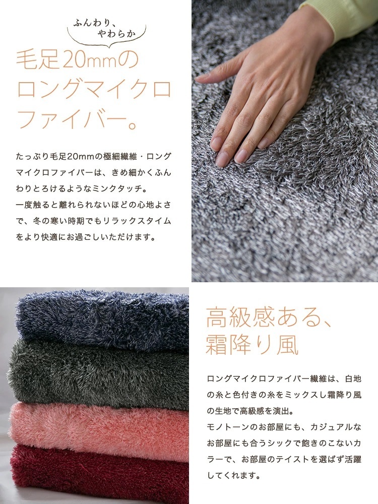 毛足は贅沢に20ミリもの長さ。ふんわりとやわらかな感触で、保温性・速乾性にも優れた超極細繊維「マイクロファイバー」のラグです。