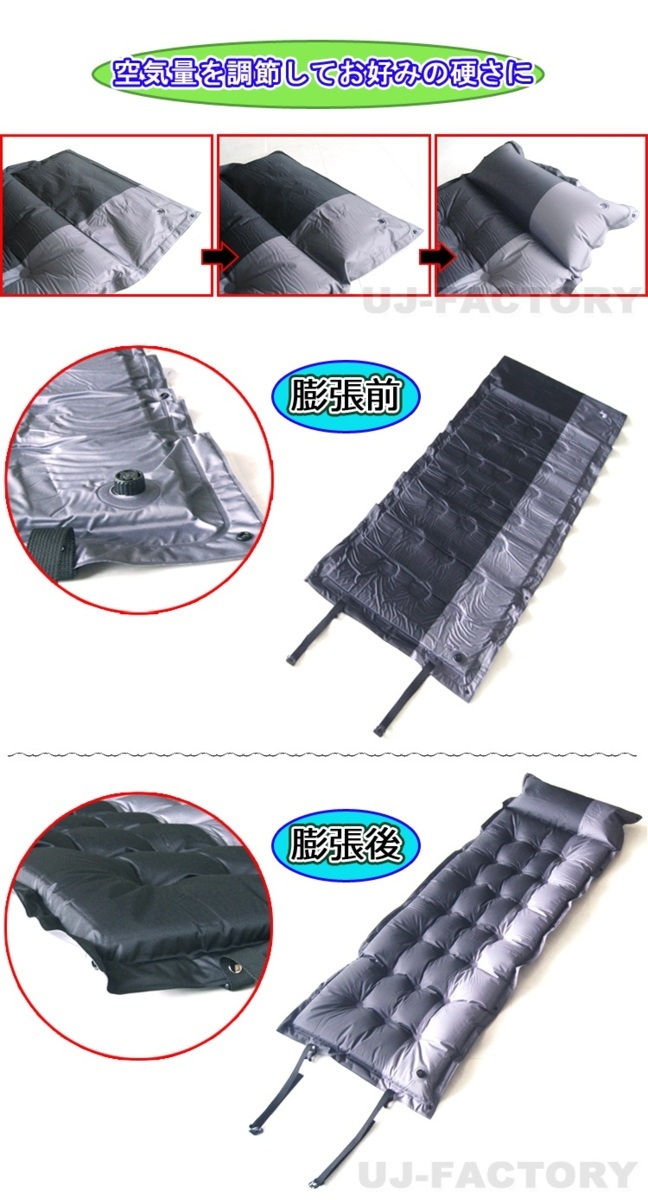 | 【 ここがポイント 】 ★高級感があり落ち着きのあるシックなカラー「ブラック&グレー」♪キャンプやピクニック、登山や車中泊と色んな場所で使用可能!もちろんあってほしくありませんが、災害の時もお役立ちグッズです。 ★空気取り入れバルブを開けることで自動的に膨張が始まります。バルブを開いて約5分自動膨張式で手間要らず!1830mm×640mmと十分な広さ♪厚みも約50mmあり「ふかふか」で快適です。 ★枕部分のみ、空気を吹き込むことが必要です。 ★マットは複数の連結も可能で、家族やグループでワイワイ広々と使えます。 ※このオークションは、タイトルに表記のサイズ及び数量です。