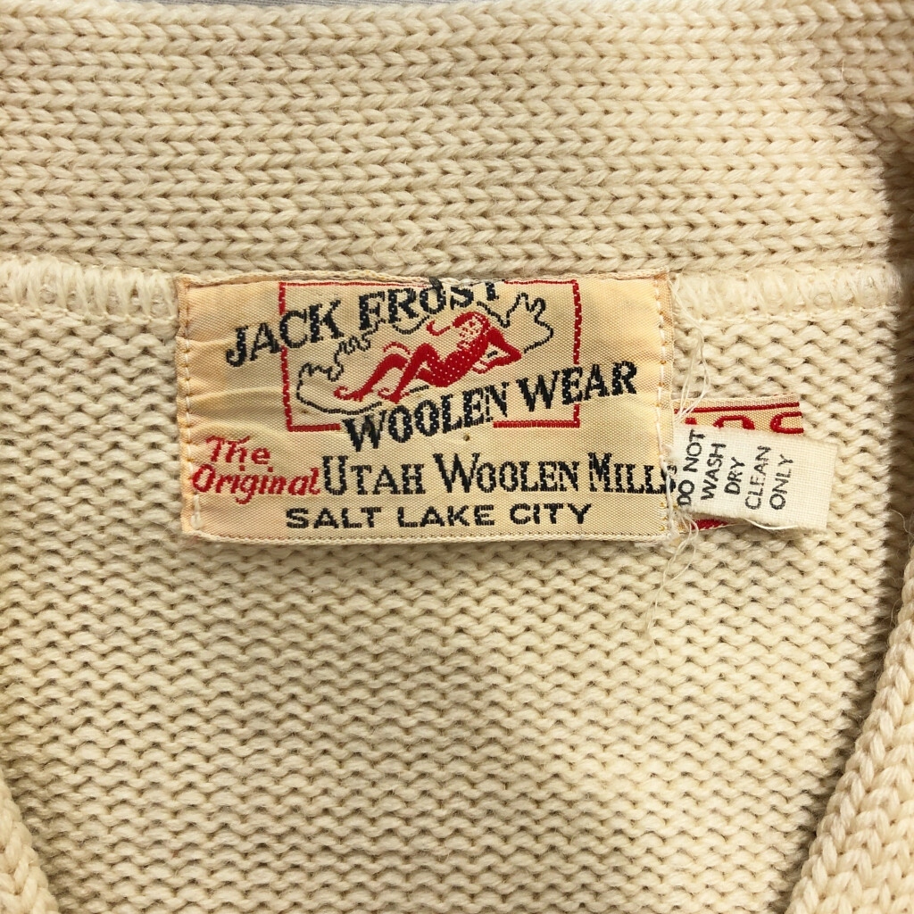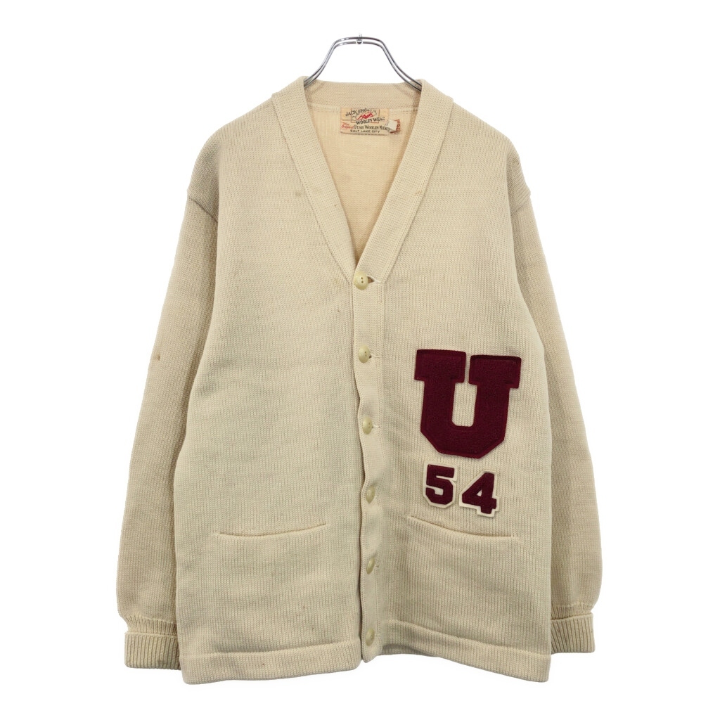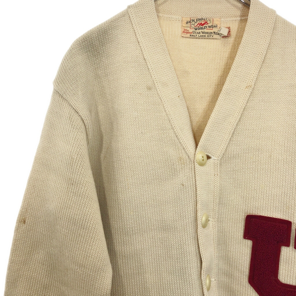 | 【商品管理番号】 V0401 【サイズ】 L相当 【実寸サイズ】 肩幅:約48cm 着丈:約72cm 身幅:約53cm 袖丈:約61cm 【主な素材】 表地 : ウール 【色】 アイボリー 【仕様】 生産国 : USA製 40年代 ヴィンテージ、カレッジ レタードニット 【状態】 汚れ:全体 キズ:背中 破れ:背中 | |||