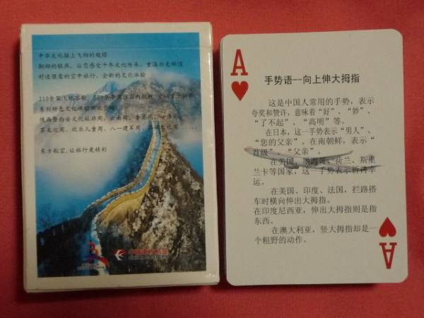 ☆商品説明☆ご覧いただきありがとうございます^^ 中國東方航空オリジナルのトランプ です。厚紙製。飛行機の絵柄で1枚1枚にお話が書いてあり、と~ってもかわいいですよ^^ 大きさはタテ 約9cm、ヨコ 約6.5cmです。コレクション用として大切に保管していましたので新品、未使用でたいへんきれいな状態ですが家庭で保管していた物になりますのでご理解いただける方のご入札をお願い致します。 ☆発送方法☆ 定形外郵便、ゆうぱっく ☆コメント☆ ノークレーム、ノーリターンでお願いします。ご不明な点がございましたらお気軽にお問合わせ下さい。他にもキャラクターグッズたくさん出品しております☆ 良かったらご覧下さいね*^^*