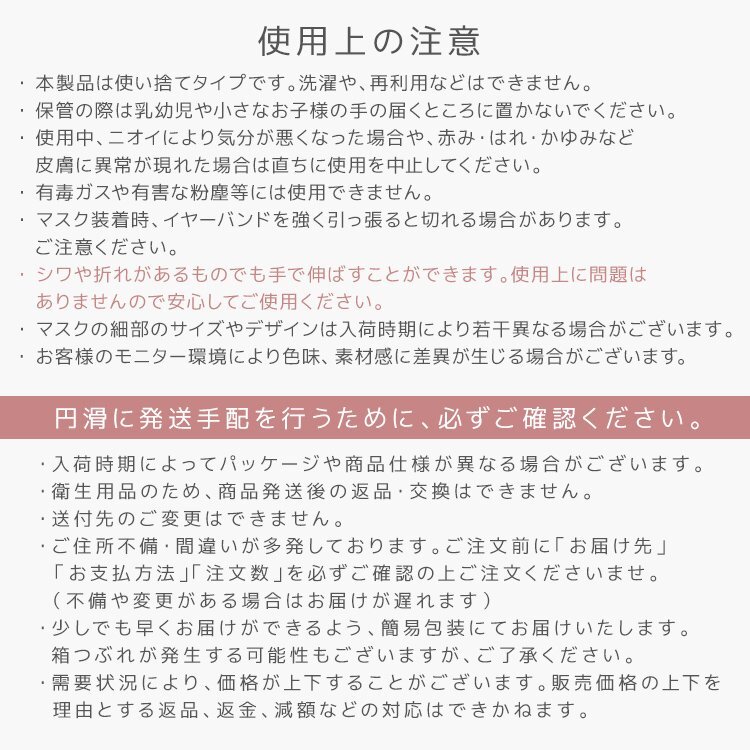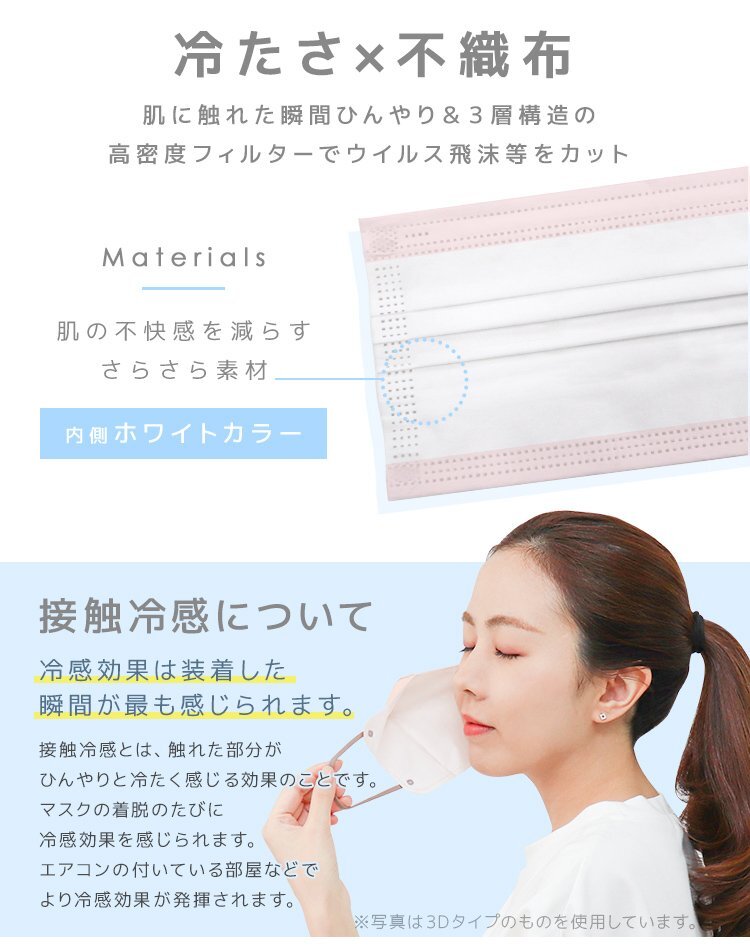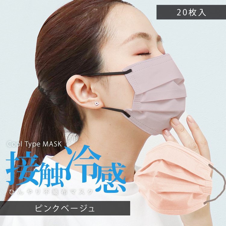 新登場!冷感不織布マスク 暑さによる蒸れ、湿気の不快感を解消! 内側に接触冷感素材を使用しています。(内側 ホワイトカラー) 3層構造の高密度フィルターで飛沫等をカット 【商品詳細】 ◆内容:冷感マスク 20枚入(入荷時期により5枚ずつもしくは10枚ずつの包装) サイズ(約):幅175mm×高さ95mm(要画像参照) ◆生産国:中国 ◆カラー:【ピンクベージュ】 ◆生産国:中国 ◆保証期間:7日間 ※商品到着後7日以内の初期不良・破損のみご対応させていただきます。