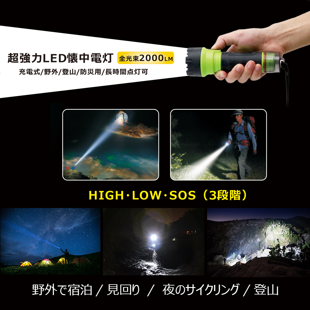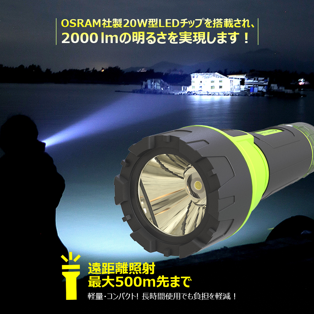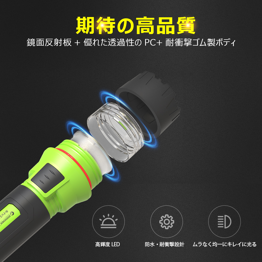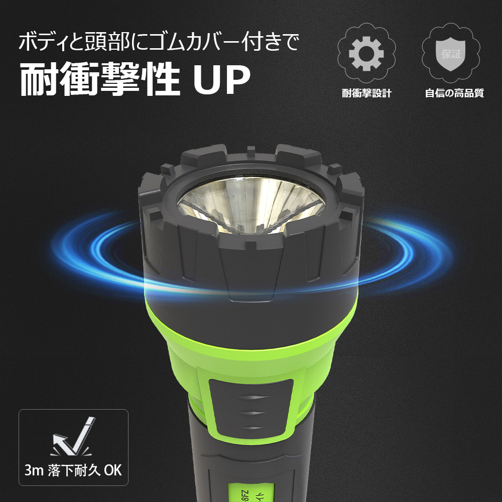 ■絶縁カバー・防水・滑り止め:日常用品のほか、雷がなる雨天でも安心にご利用可! ■防災対策に絶好グッズ:存在を警告する点滅ライト、周囲の注意を喚起するホイッスル、明るくて目立った緑色のボディー、万が一の時必ず役に立てる。 ■電池交換不要!専用充電器利用で充電必要! ■耐衝撃性向上:ボディと頭部にゴムカバー付きで耐衝撃性UP! ■優れる放熱性、耐久性:PC製ボディで軽くて熱くなりにくい!それに相応した耐久性もめ立っている! ■遠距離照射:最大500m先まで |