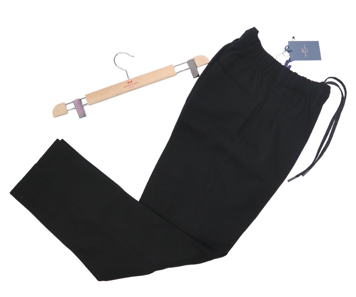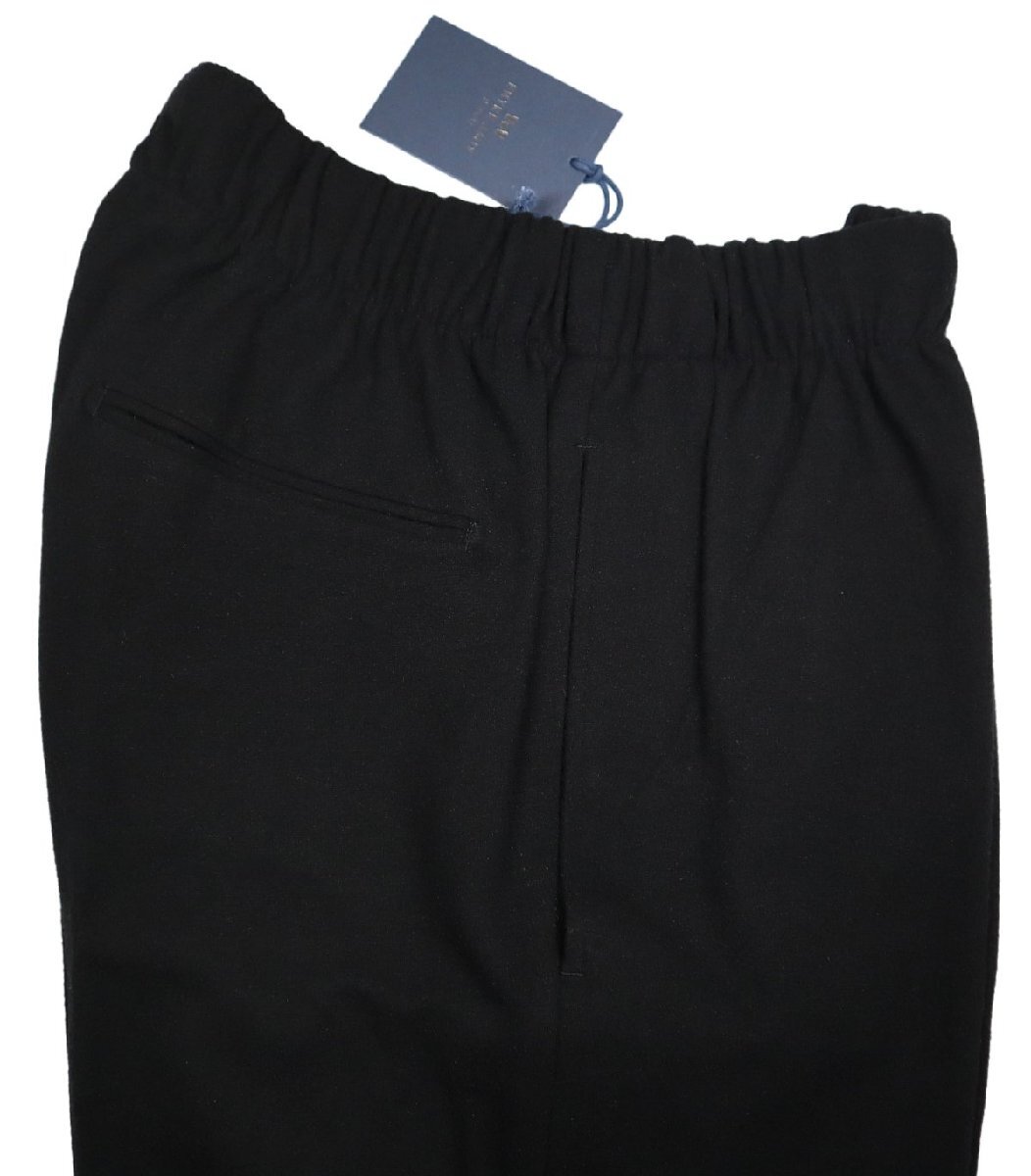 ジャージーウェット素材ならではのはき心地は快適そのもので、イスの立ち座りもラクチン。長時間の移動による旅行にも最適ですし、ジャケットにもマッチし裾がリブ仕様ではないので、出張や旅先での雰囲気の良いレストランスタイルとしても便利。ダウンやレザージャケットなどのカジュアルウェアだけでなく、テーラードジャケットやテーラードコートなどのきれいめスタイルにもマッチします。 ウエスト紐は内側についていて、紐を出すことも中にしまうこともできます。カジュアル的には出して、テーラードアイテムと合わせる際はしまっても良いかと思います。 裾は最初から九分丈かノークッションのシングル仕上げになっていますので、届いた日からはけるのもうれしいところ。裾をかるくひと折りして細ダブルのようにはいてもいいでしょう。 ブラックの起毛ウールライクパンツのため非常にシックで上品なお色ですが、ついた白い毛が目立ちやすくもあります。こまめにブラッシングするなど気をつけてください。 落札していただいた方には、純正パンツハンガーをお付けいたします。ただ配送方法にて「レターパックプラス」や「佐川急便60サイズ」をご選択されますとパンツハンガーはサイズ的に入らないため、付属しなくなります。ご希望の方はお気をつけください。パンツハンガーご希望の方は「佐川急便80サイズ」か「エコ配」などをご選択下さい。 こちらは「国内正規品」になります。 きっとこれからの大活躍間違いなしでしょう。サイズの合う方にはぜひオススメです!