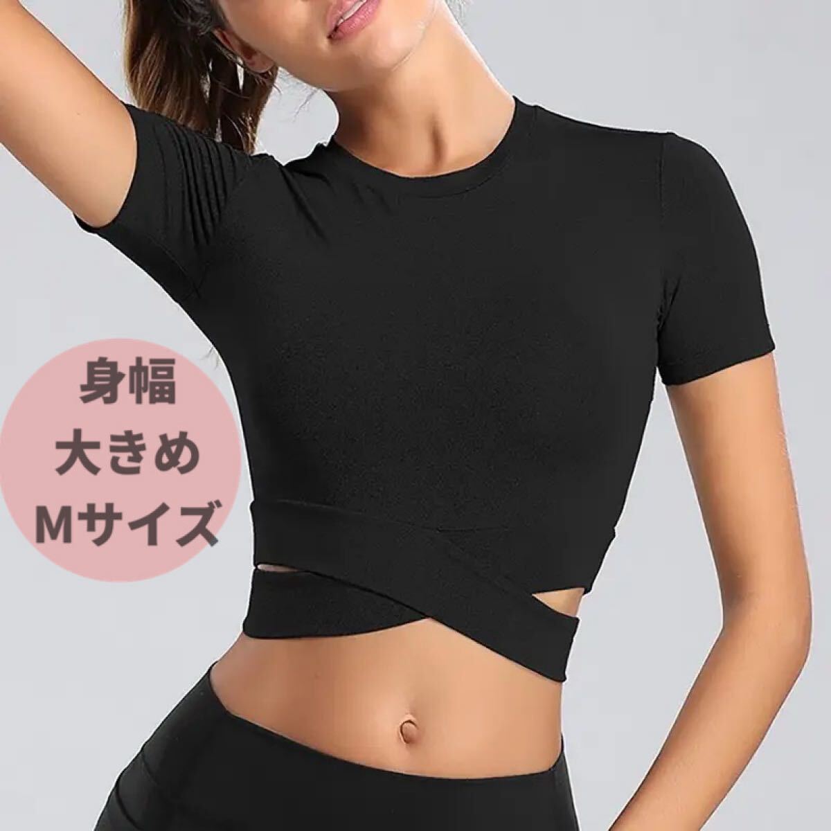 ウエストクロス半袖ショートトップスMサイズ黒 スポーツ ヨガウェア Tシャツ