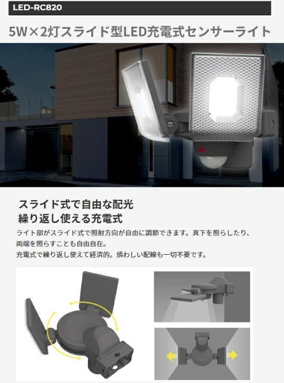 5W×2灯スライド型LED充電式センサーライト LED-RC820 ライテックス