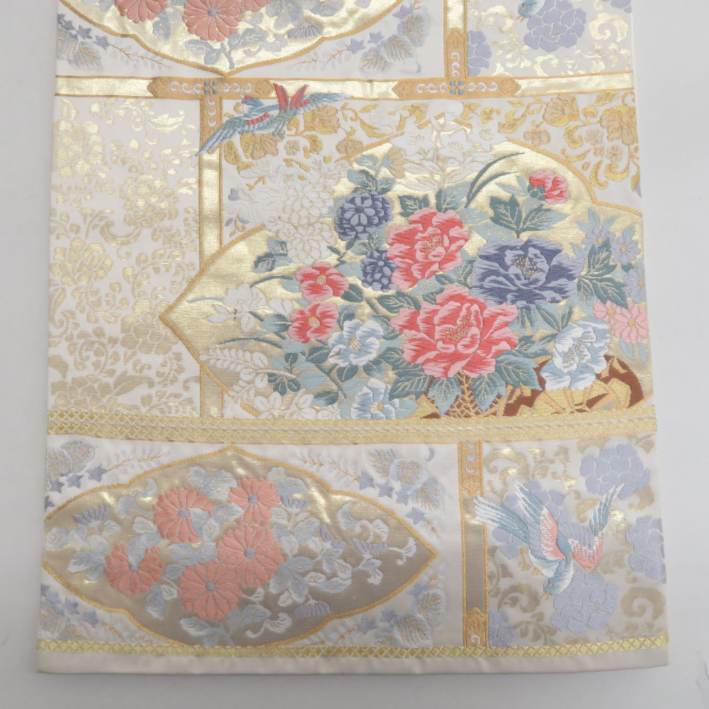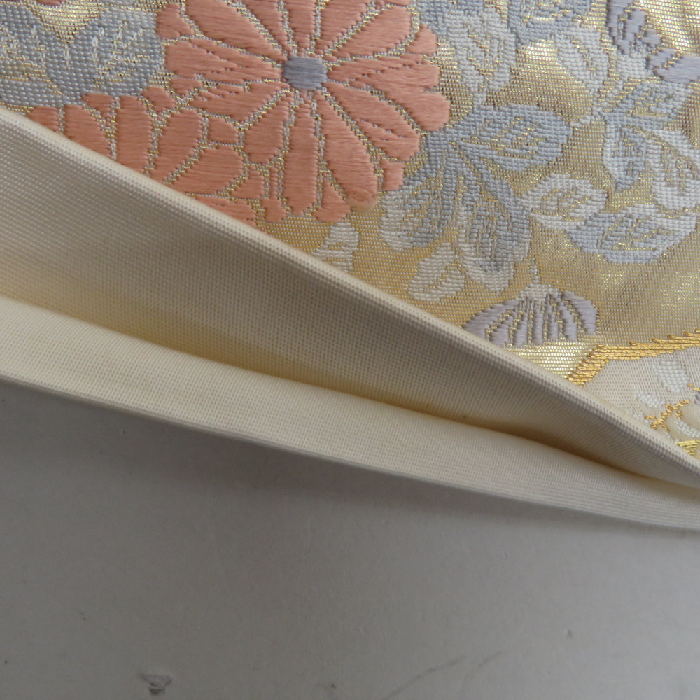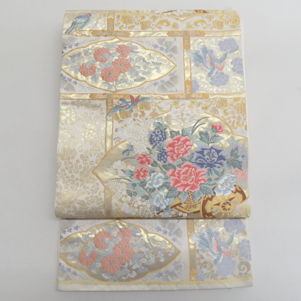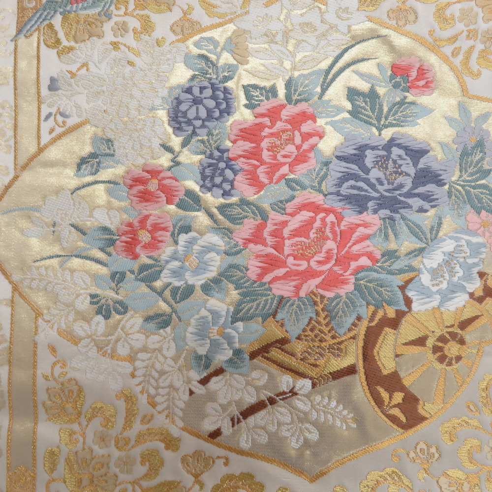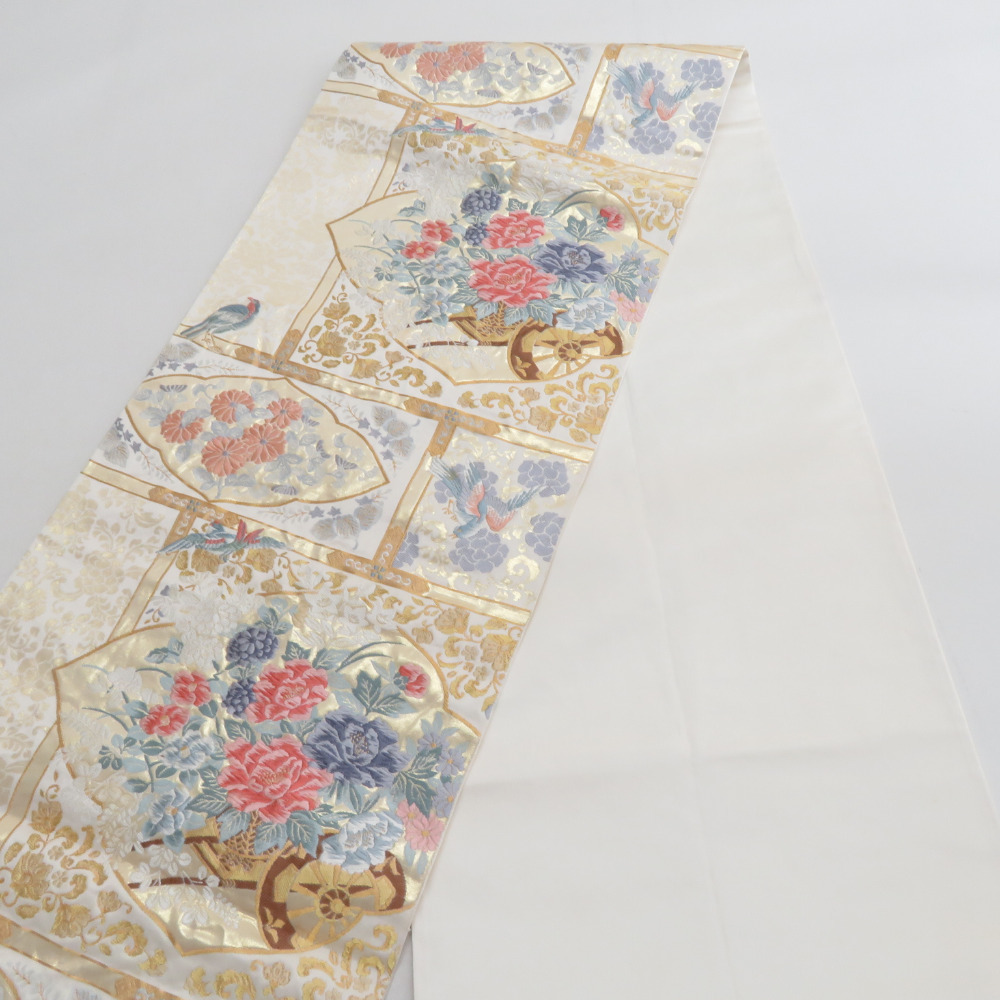 | 袋帯 白地 金糸 花車文様 金色xピンク色x多色 六通柄 正絹 仕立て上がり 着物帯 長さ440cm |