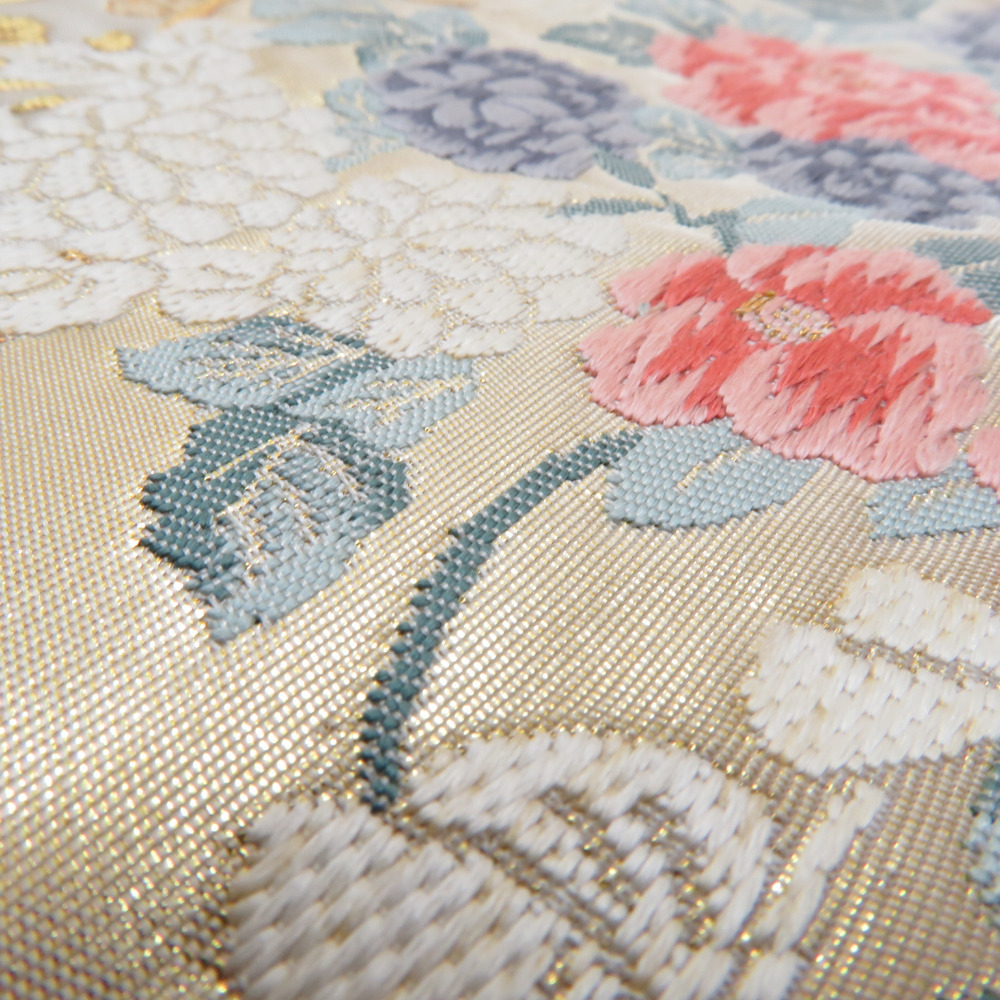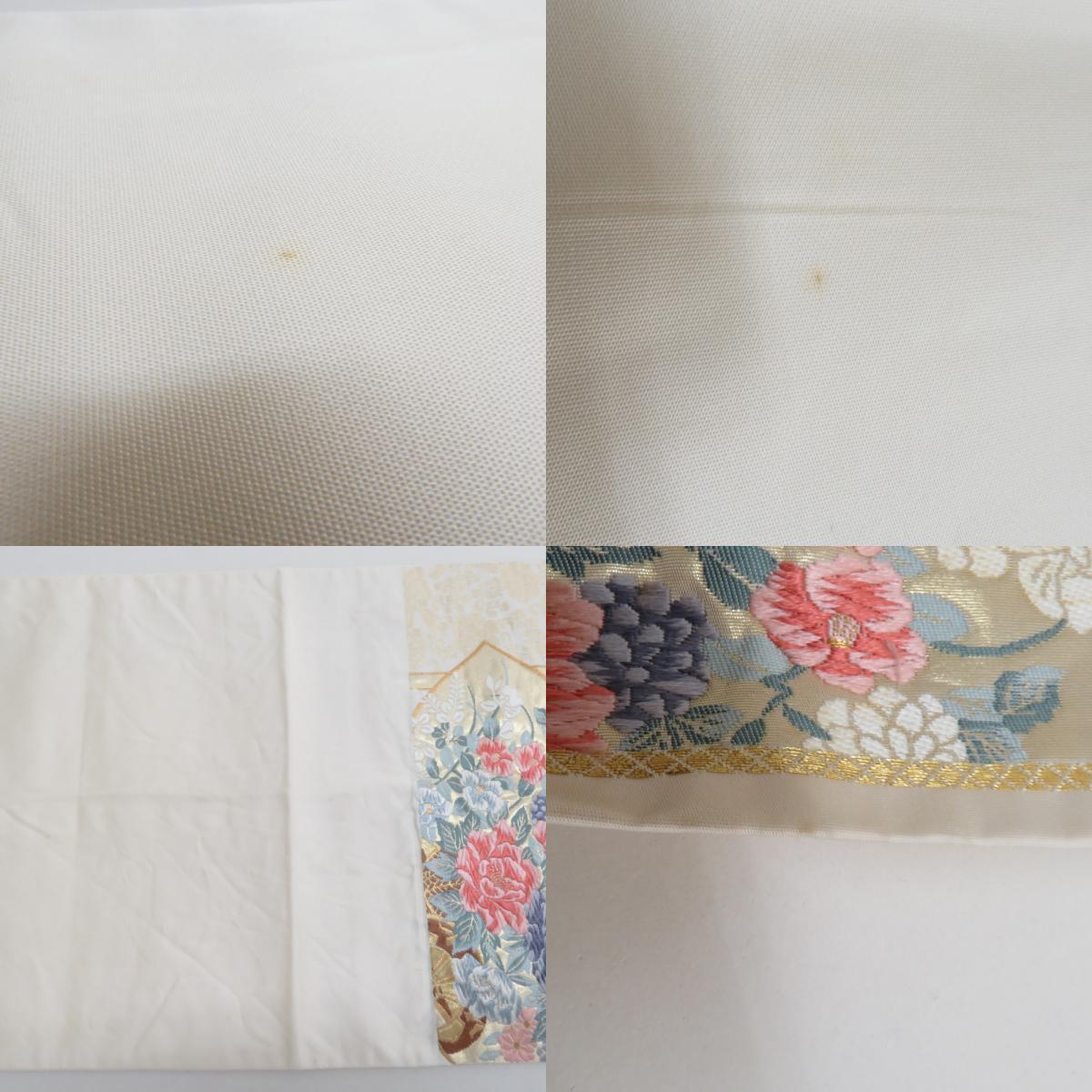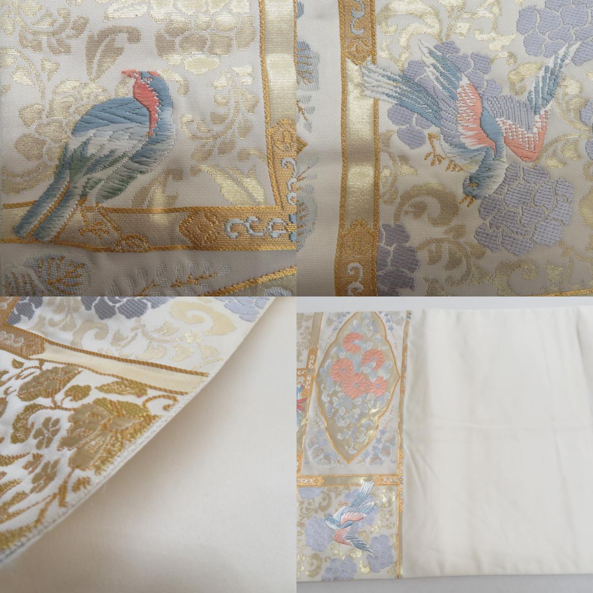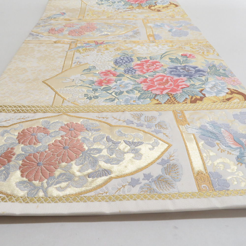 | 袋帯 白地 金糸 花車文様 金色xピンク色x多色 六通柄 正絹 仕立て上がり 着物帯 長さ440cm |