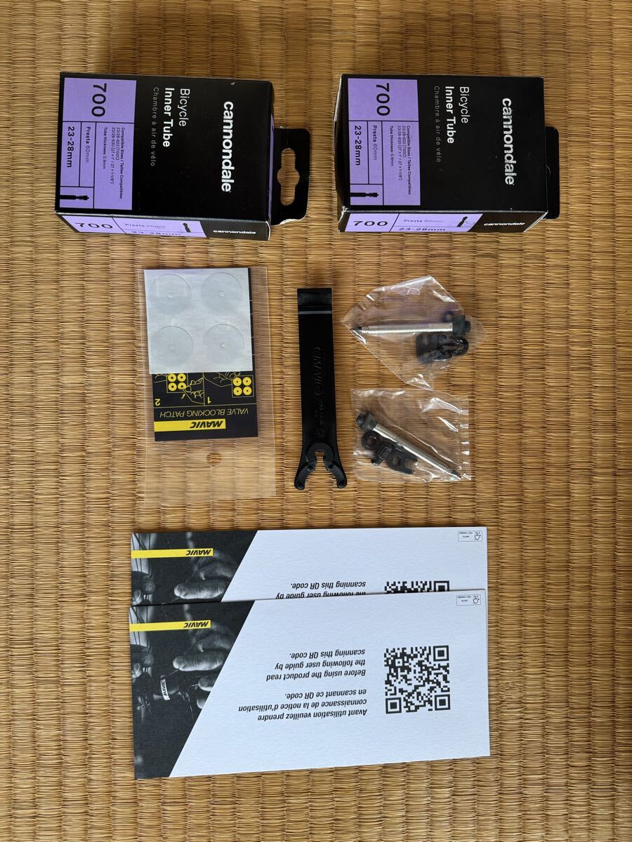 画像の付属品をお付けしますし、このホイールに適合する60㎜バルブ長のチューブも2本お付けします。