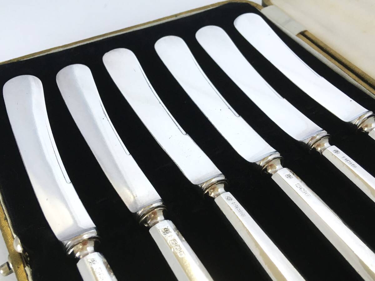 今から110年前の1915年製、英国『James Deakin & Sons (John & William F Deakin) SHEFFIELD』純銀ナイフ6本セットです。