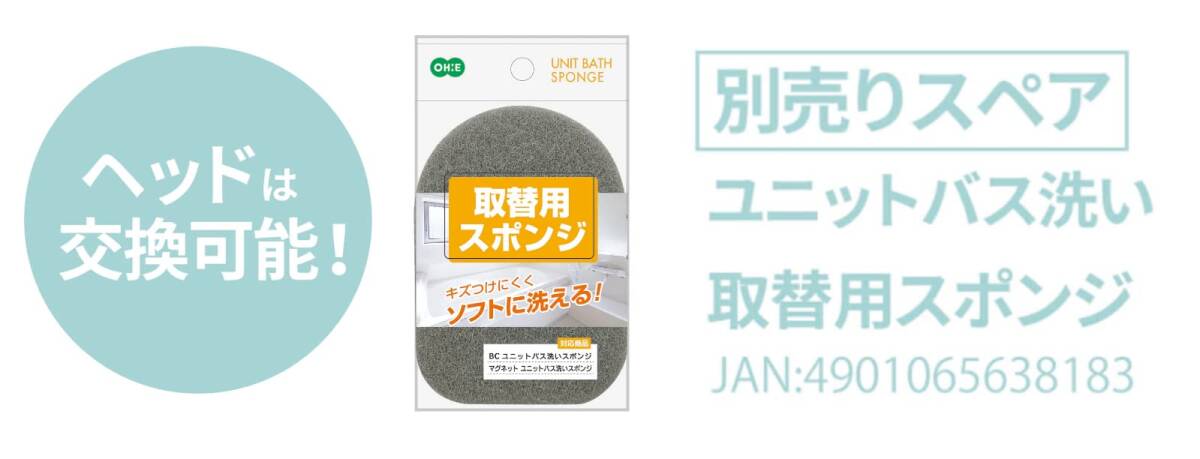 説明 ・磁石でピタッ!ユニットバスの壁に! ・壁・浴槽に!ソフトに洗える! ・キズつけにくくソフトに洗えるスポンジ。 ・浴室・浴槽洗いに。 ・マグネット付く浴室の壁なら、好きな場所へ簡単に取り付けて収納できます。 ・先端のスポンジは脱着式なので、別売りスペアと交換出来ます。 ※取り換えの際は、本体に付着した不織布繊維を取り除いてから貼り付けて下さい。 【マグネット収納時のご注意】 ●電子機器類(時計、パソコンなど)、磁気カードなど磁気に弱いものを近づけない。 ●マグネットがはがれたり、本製品が落下するおそれがあるため、曲面や開閉するドアへの取り付けは避ける。 ●取り付けた状態で引きずるようにうごかすと、取り付け面をキズキズつくことがある。 ●過度な力を加えたり乱暴に扱うと、本製品が落下したりずれたりして破損やケガ、または取り付け面をキズつける原因となる。 ●長期間取り付けたまま放置すると、外しにくくなったり、壁に跡が残ったり汚れやカビが発生することがあるため、取り付け面は定期手に変える。 【使用上の注意】 ●用途以外には使用しない。 ●色や光沢など、お手入れ部分の仕様により、キズがついたり、くもったりする場合があるので目立たないところで試してから使用する。詳細は浴室ユニットなどの取扱説明書の内容を見て確認する。 ●経年劣化した浴槽・浴室に使用するとキズつくおそれがあるので注意する。 ●洗うものをキズつける場合があるので、異物などが付着したまま使用しない。 ●プラスチック部分が浴槽などに当たると、キズつける場合があるので注意する。 ●ジョイント部は破損する場合があるので、無理に引っ張ったり、強い衝撃を与えない。 ●破損のおそれがあるので、ヘッドは必ず固定してから使用する。 ●柄の長さを調節するときに空回りする場合、違う場所でしめなおしてから少しゆるめて、その後好みの位置に合わせてしめる。 ●使用後は流水で洗剤や汚れをよく洗い落とし、水気を切って乾燥させる。 ●火のそばや高温になる場所には置かない。 ●商品が劣化する場合があるので、塩素系の漂白剤や熱湯などの使用は避ける。 ●中性以外の洗剤は、商品を傷める場合があるので注意する。 ●廃棄時は各自治体の定める方法に従って処理する。 ※商品の仕様は、改善改良のため予告なく変更することがあります。