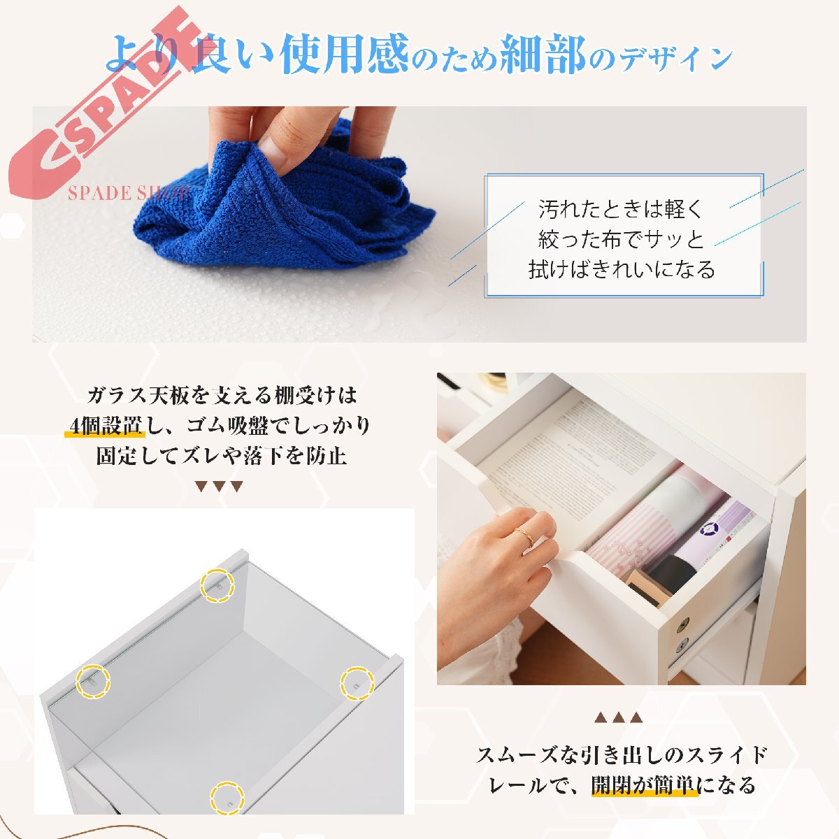 • 【おしゃれで実用的な天板設計】ガラス天板下は中が見えるディスプレイスペース付き。4点の棚受け+ゴム吸盤でしっかり固定され、ズレや落下を防止。作業台としても活躍し、日常を快適に。
