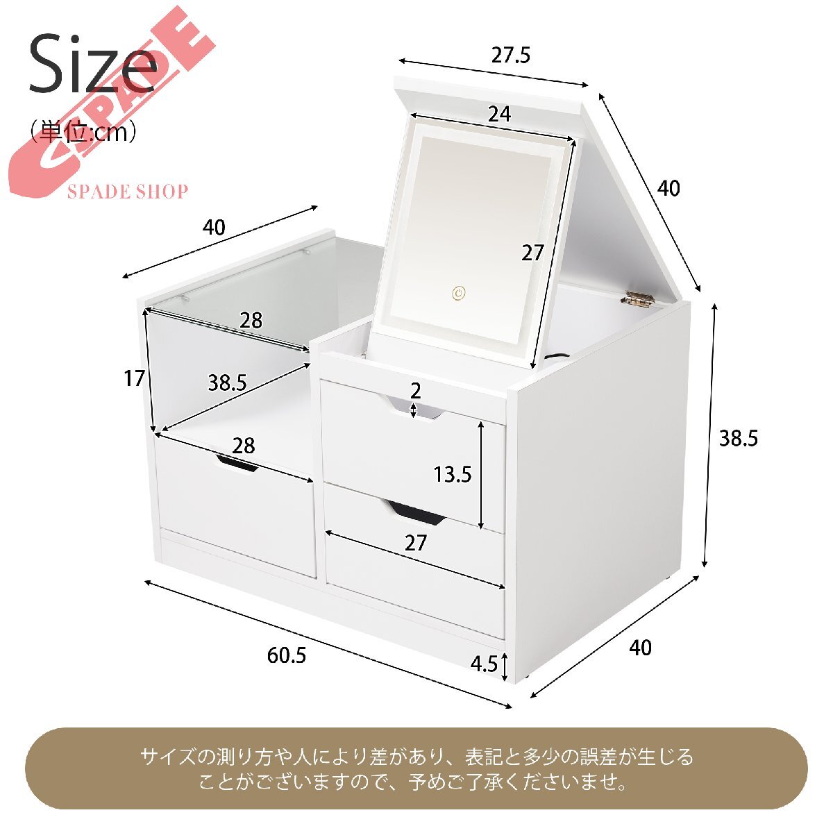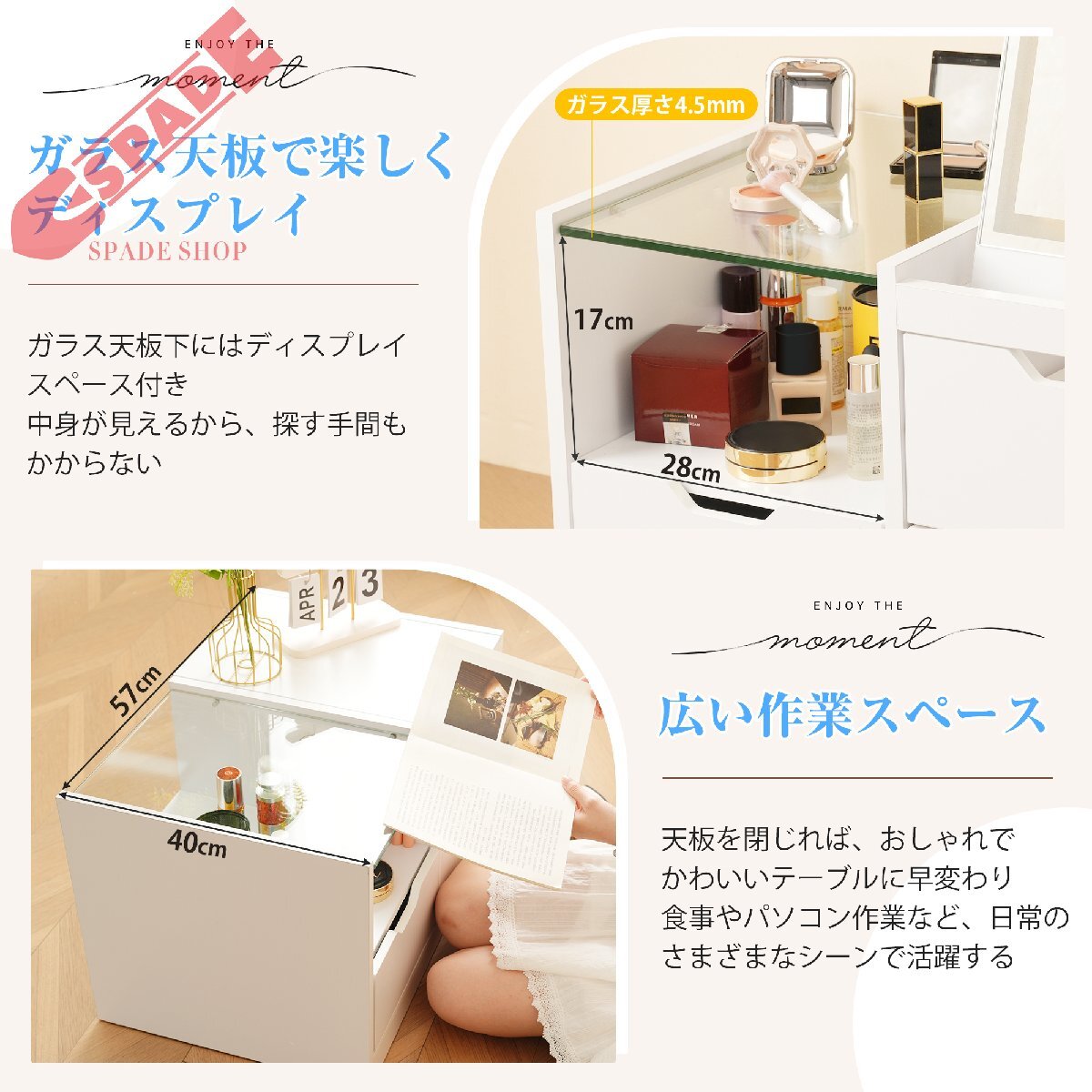 • 【3段階角度調節ミラー】天板下に設置された大きめのミラーは角度を3段階で調節可能。顔全体が映る設計でアイメイクなど細かい作業もラクラク。
