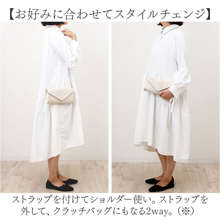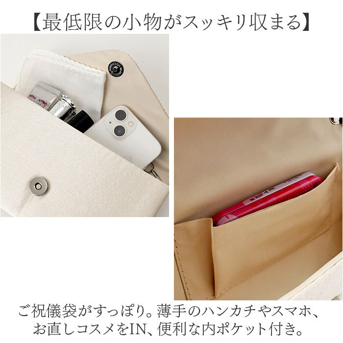 | 商品説明 | ・・【フォーマルなシーンでコンパクトに】 ・パーティーや結婚式のお呼ばれシーンで大活躍♪おしゃれな「パーティーバッグ」。 ・【上品な華やかさが魅力】 ・程よい光沢感のある生地に、キラッとビジューを取り入れたデザイン性のあるフラップ☆ ・【お好みに合わせてスタイルチェンジ】 ・ストラップを付けてショルダー使い。ストラップを外して、クラッチバッグにもなる2way。 ・(※)バッグ内側にストラップを取り付けるフックがあります。 ・【マグネット式でワンタッチ開閉】 ・フラップは力いらずで簡単◎大きく開いて出し入れしやすく、閉じれば中身の飛び出しもガード。 ・【最低限の小物がスッキリ収まる】 ・ご祝儀袋がすっぽり。薄手のハンカチやスマホ、お直しコスメをIN、便利な内ポケット付き。 ・【どなたでも持ちやすいデザイン】 ・どんなドレススタイルにも合わせやすい、シンプルなつくり。お気に入りカラーをチョイス。 ・【ポケット仕様】 ・内側:オープンポケット×1 |