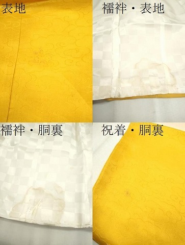 | 産着【祝着:正絹、襦袢:化繊・五つ紋】の状態は接写画像のように祝着の表地・胴裏、襦袢の表地・胴裏に薄い汚れがございます。 大変上質な逸品になりますので ぜひお手入れをされてお召しになられてはいかがでしょうか。 お安く出品致しますので、是非この機会にいかがでしょうか?