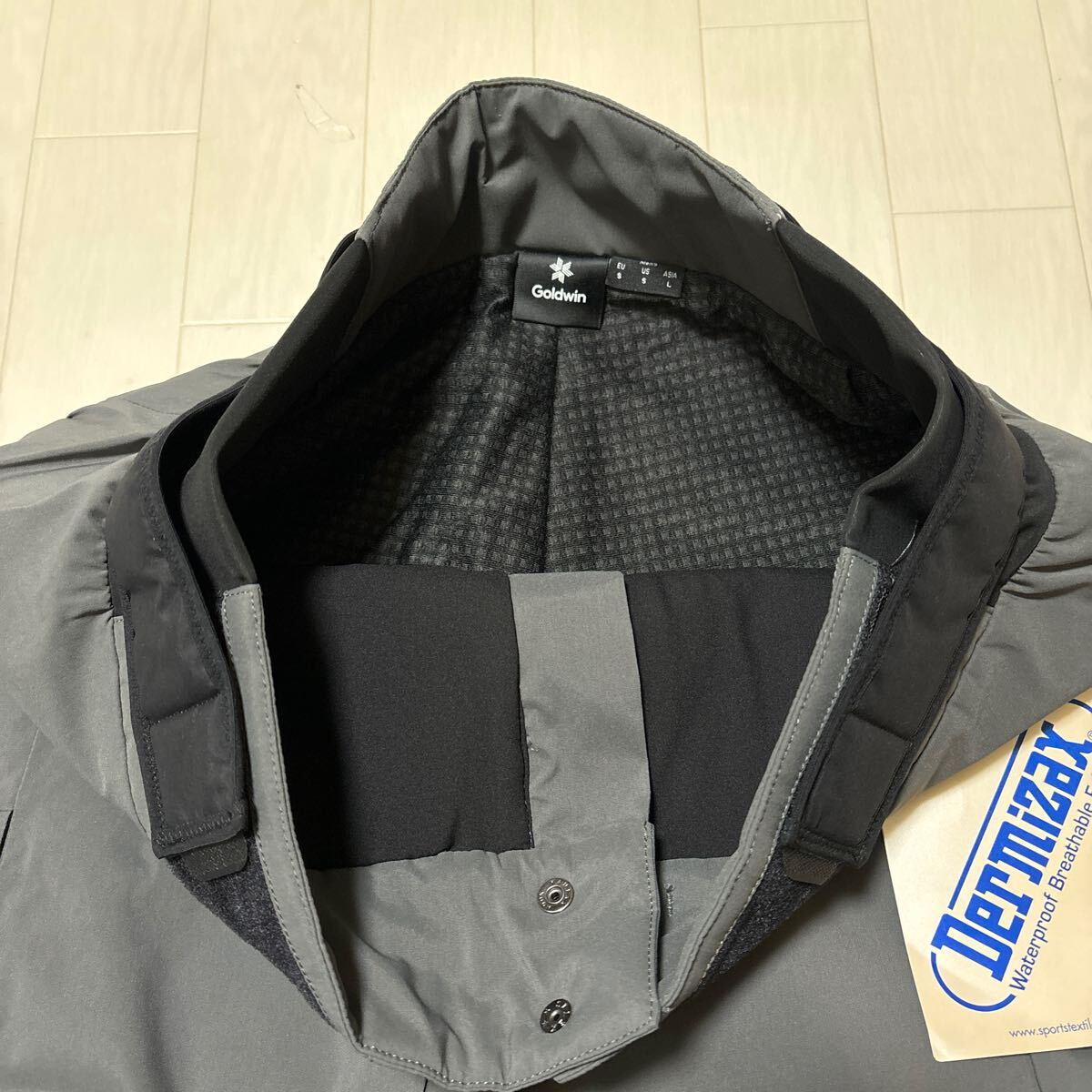 表素材には、Dermizax(R)2WAYストレッチ生地(耐水圧:20,000mmH2O or Higher(JIS L1092)透湿度:10,000g/m2)を使用。