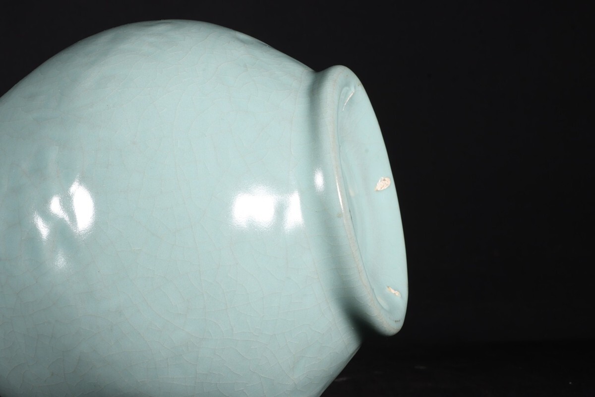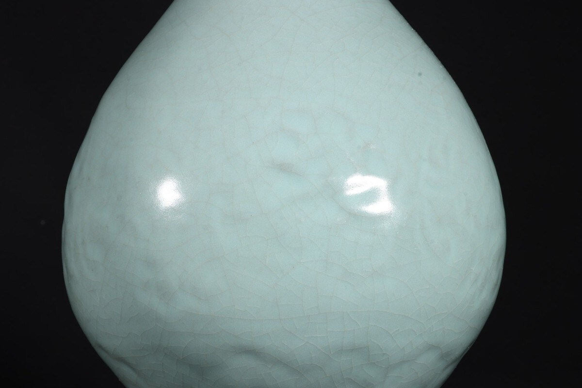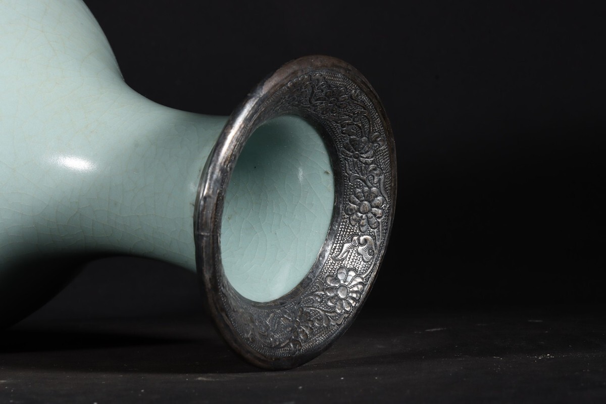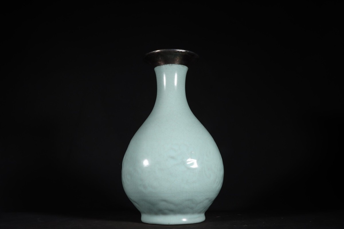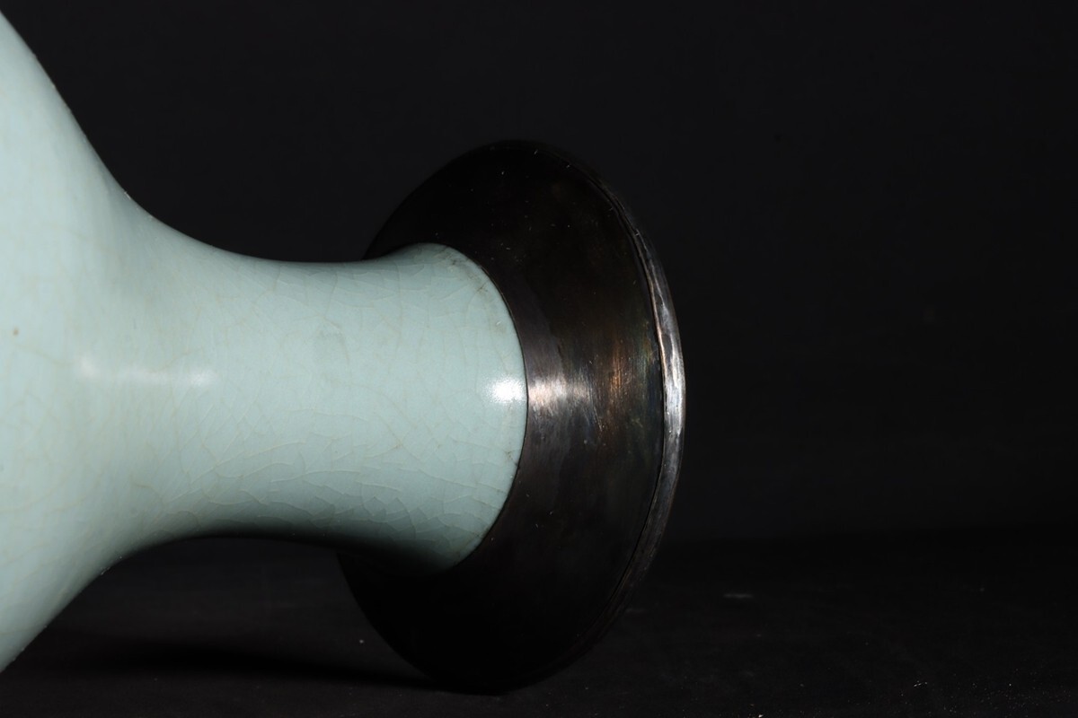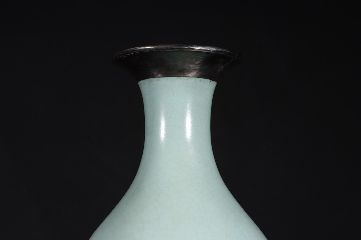 「宋 汝窯 陶磁器 天青釉純銀鏨刻 鵝頸瓶」染付 置物 擺件 古賞物 中国古美術 旧蔵出