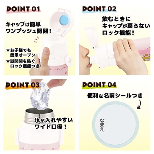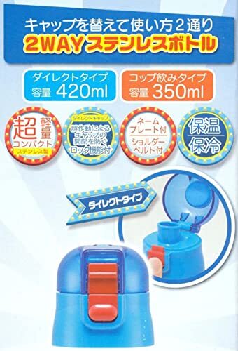 直飲みもコップ飲みも両方できる水筒 冷たい飲み物がそのまま飲める 直飲みもコップ飲みもできる2WAYタイプ 不意にフタが開くのを防ぐロック機能付き 熱い飲み物はコップ飲みがおすすめ お子様から小学生にちょうど良い飲み切りサイズ350ml 肩から下げられるショルダーベルト、ネームプレート付き