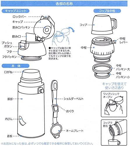 ・素材・材質:内びん・胴部・口がね=ステンレス鋼 コップ・中栓・フタ=ポリプロピレン(br)キャップ=飽和ポリエステル樹脂 パッキン=シリコン樹脂
