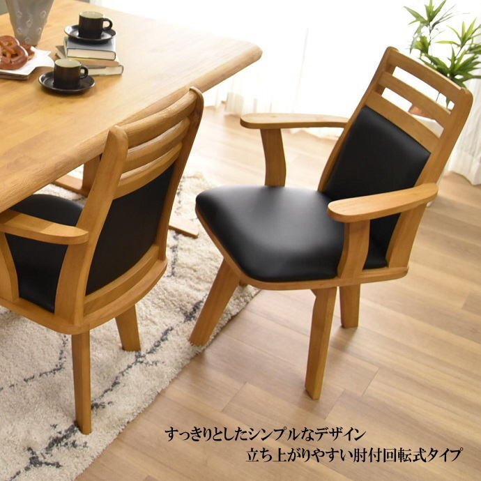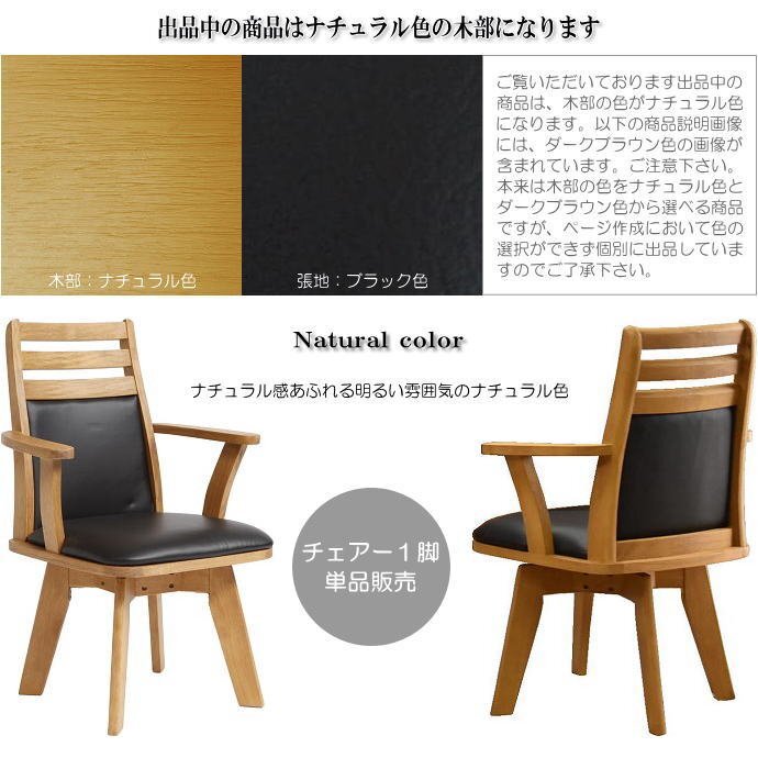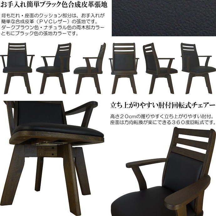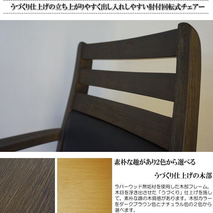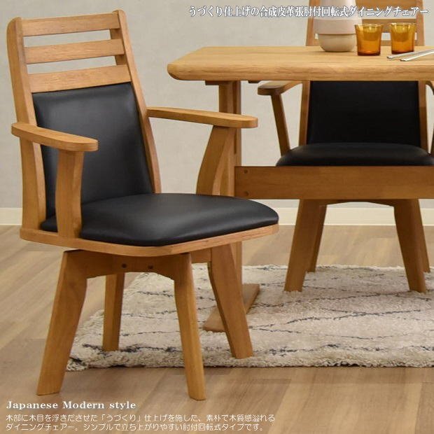 | 【商品名】 | うづくり仕上げブラック色合成皮革張肘付回転式木製ダイニングチェアー (ナチュラル色) |