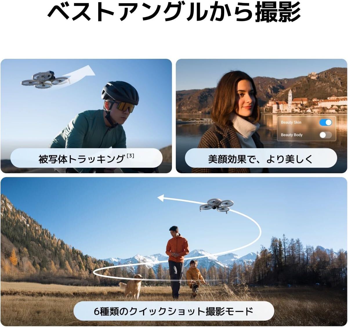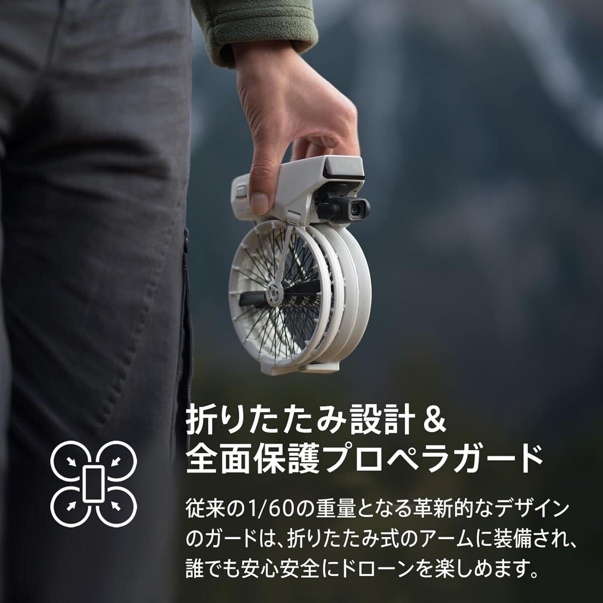 コンパクトな設計で、どこへでも簡単に持ち運べ、すぐに飛行可能。旅行やアウトドア、プロの映像制作のお供に最適です。
