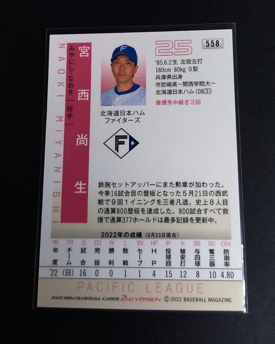 2022年BBM 2nd 宮西尚生(日本ハム)銀箔サイン入り。No,558。
