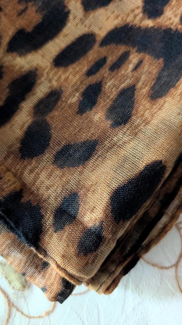 シースルー生地に豹柄入り、薄くて、綺麗なストールです。ずっと巻いていたくなるとろみ感のある、とっても優しい肌触りで、身にまとうと適度なボリュームが出て華やかです。優雅に羽織ったり、巻いたり、シーンに合わせ楽しめる逸品♪また母の日や誕生日プレゼント、クリスマスプレゼントにも是非♪夏の紫外線対策にも。