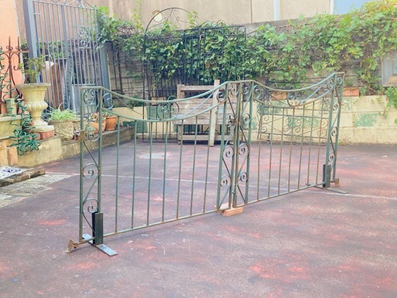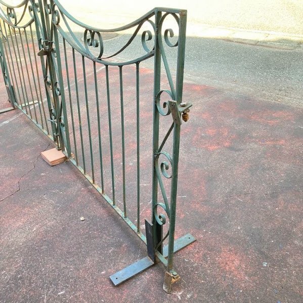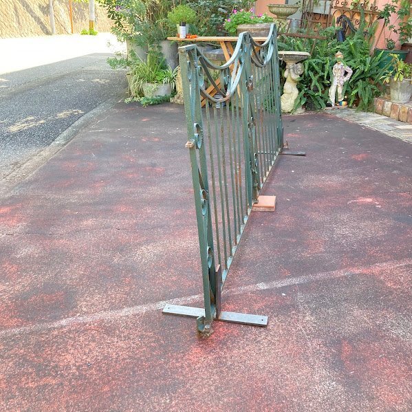 グリーンにペイントされ曲線を描く両開きのアイアンゲートが届きました【44-252G】左右ペアのセット。全長233㎝ありますので、大きなサイズをお探しの方におすすめです。左右のサイドには固定用のプレート可動式が3か所、穴のみ(径3.5㎝)が1か所付属。中央に左右を固定する可動式のフックと、落とし棒(下向きの棒)が付属しています。推定1930年代、イギリス製。アンティークらしい錆、ペイントの剥がれや傷を含みますが、それらがあることで時代を感じさせてくれる証となります。取り付けをご検討の方は、ご自身の契約されている施工業者さまにお問合せください。福岡市南区の店舗にてお渡しもできますのでお気軽にどうぞ!※撮影に使用したスタンドは付属しません