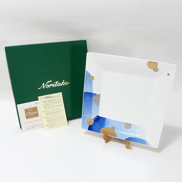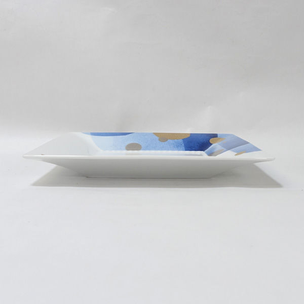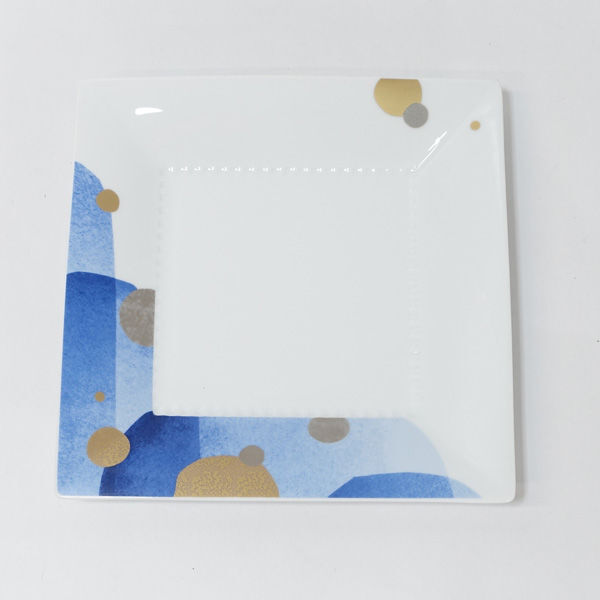 | 白磁にブルーの色紙柄、金彩をまとった上品な器です。 |