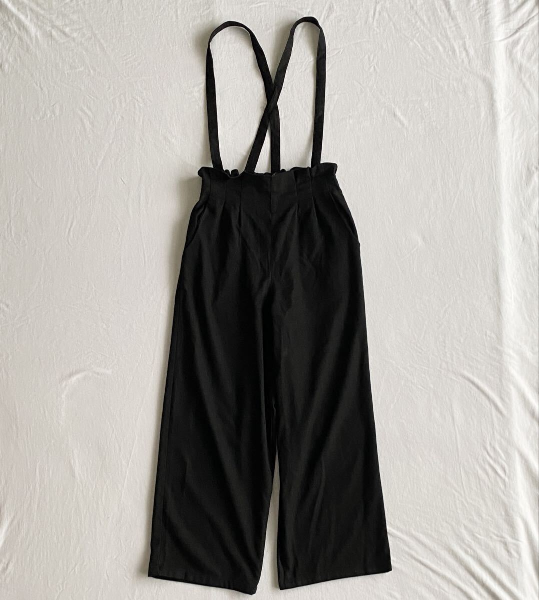 落ち感のある素材とウエストのタックが大人っぽい印象のサスペンダー付きパンツ。