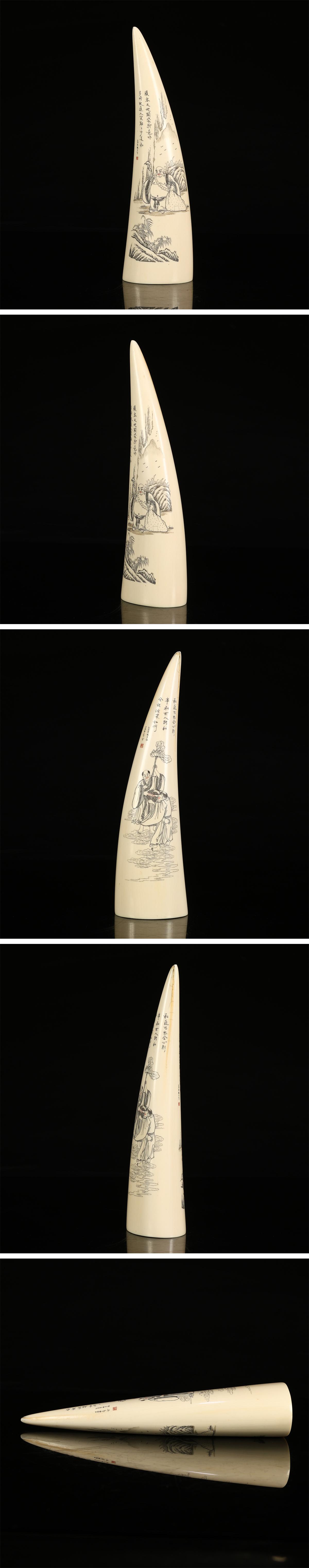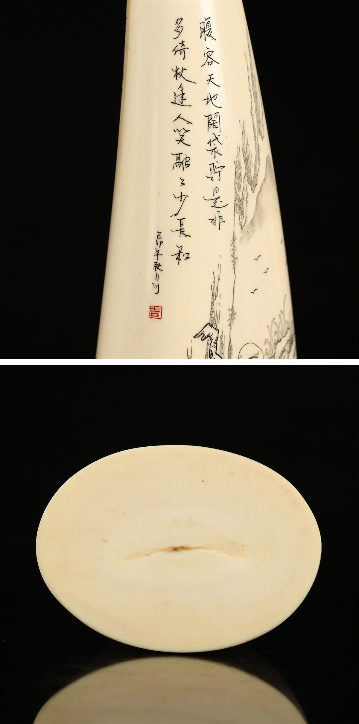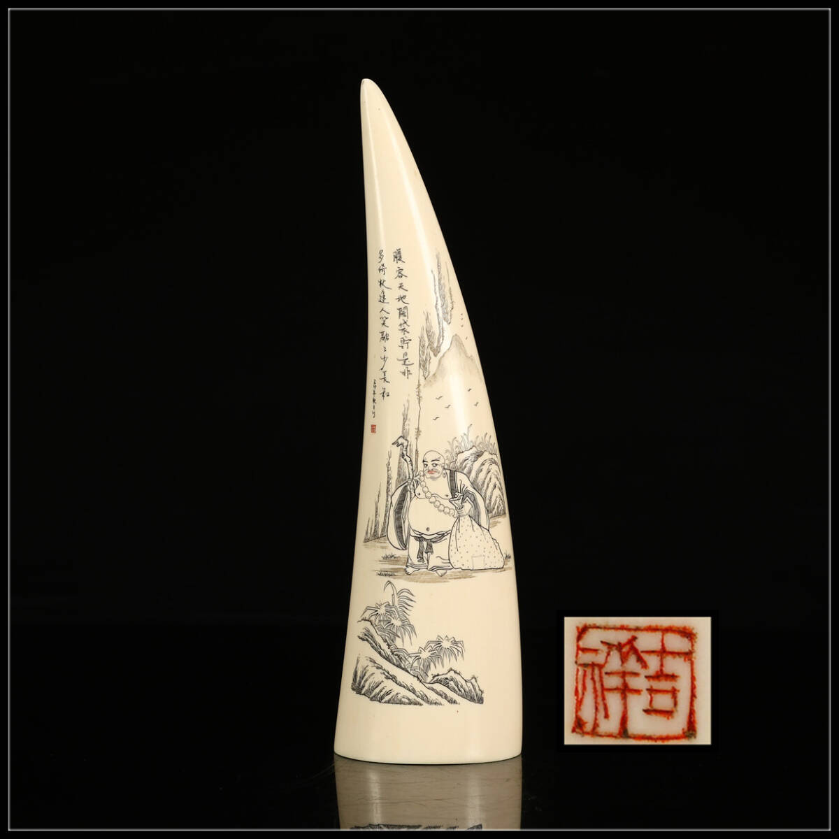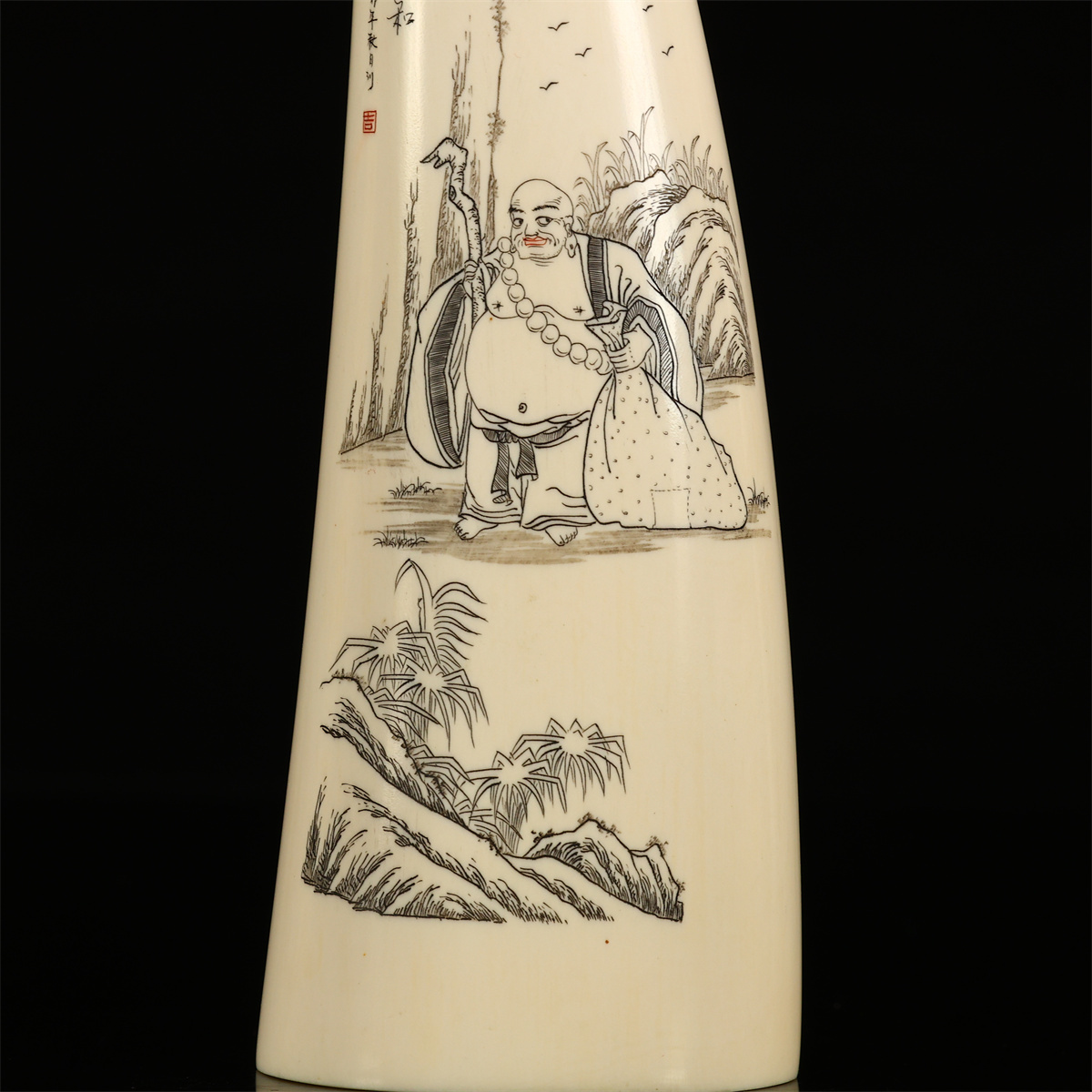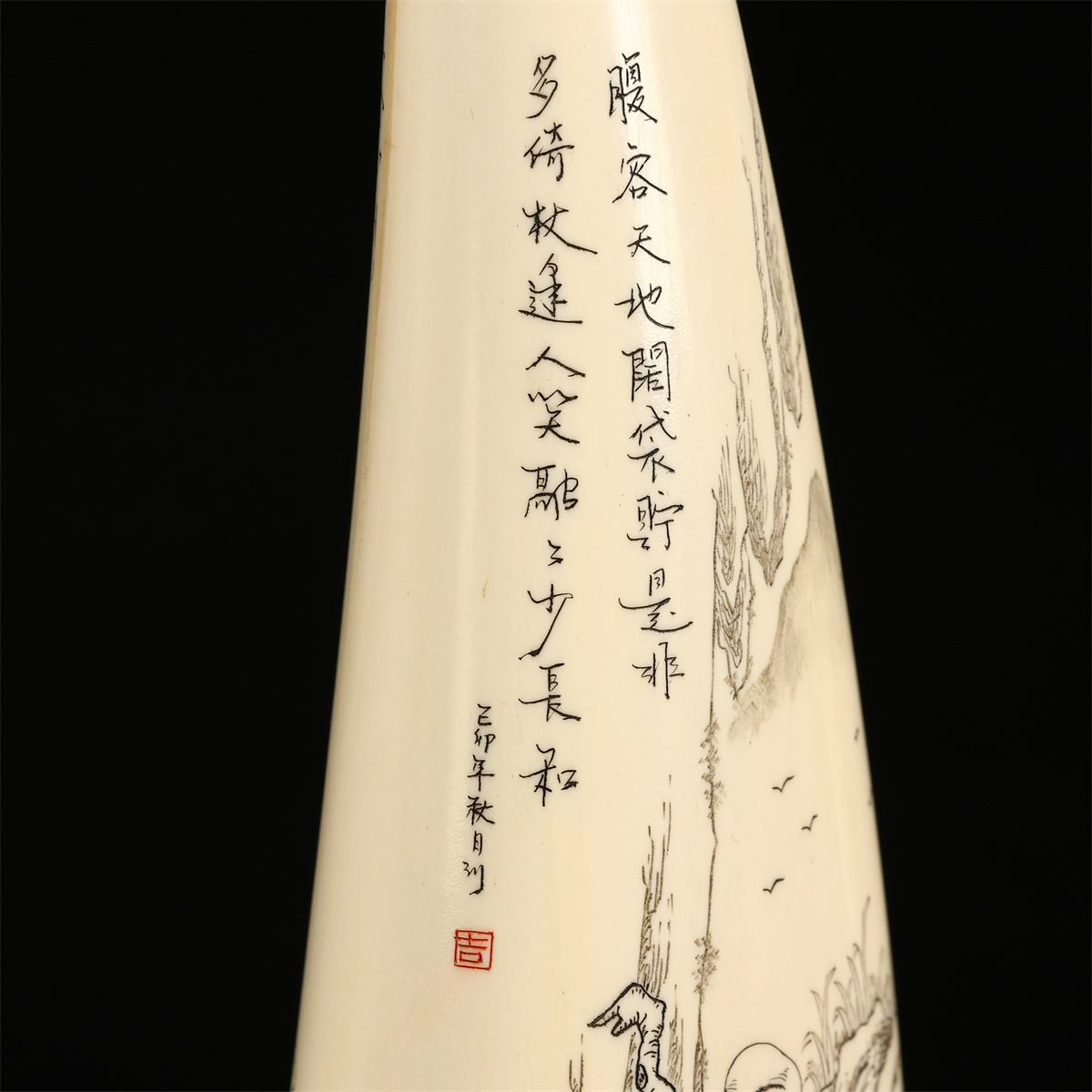 久1237 唐物 東洋彫刻 山水漢詩布袋彫刻 置物 高22.3㎝ 重421g