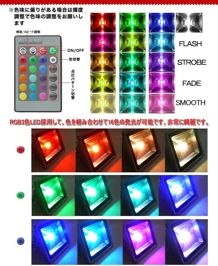 | おすすめポイント | ・赤・緑・青のLEDを組み合わせることにより16種類の色を演出。四季に合わせて照明を変えたり用途に合わせて色を自由自在に変化! ・単色のみから、1色ずつ切り替わるフラッシュ点灯、フェードイン、フェードインアウトなど雰囲気に合ったお好みの演出効果を選べます。 ・様々な色で看板を目立たせます。カラフルで動きがあるのでパトライトよりも目立たせる事ができます ・リモコンの遠隔制御距離は最大50mとなり、高い所や離れたところに取り付けていても安心操作! ・ライト本体はヒートシンク加工で放熱性UP! ・広角反射板・反射角120°ムラのないキレイな光が広がります。 ・展示場、作業灯 駐車場灯、看板灯、街灯、公園、庭、建物、駅、空港、アート、芝生、ショールーム、クラブホール、玄関常夜灯、町内防犯灯として使用!様々な用途に大活躍します。 | ||