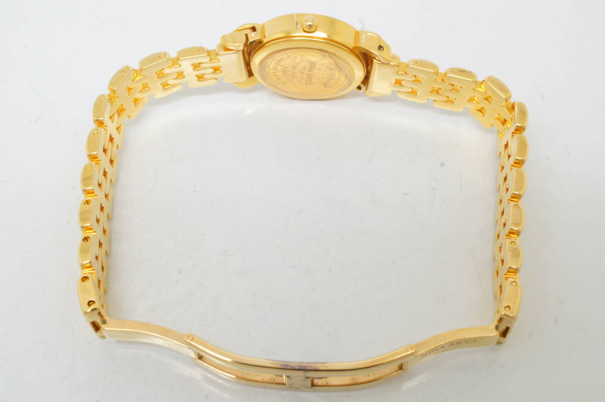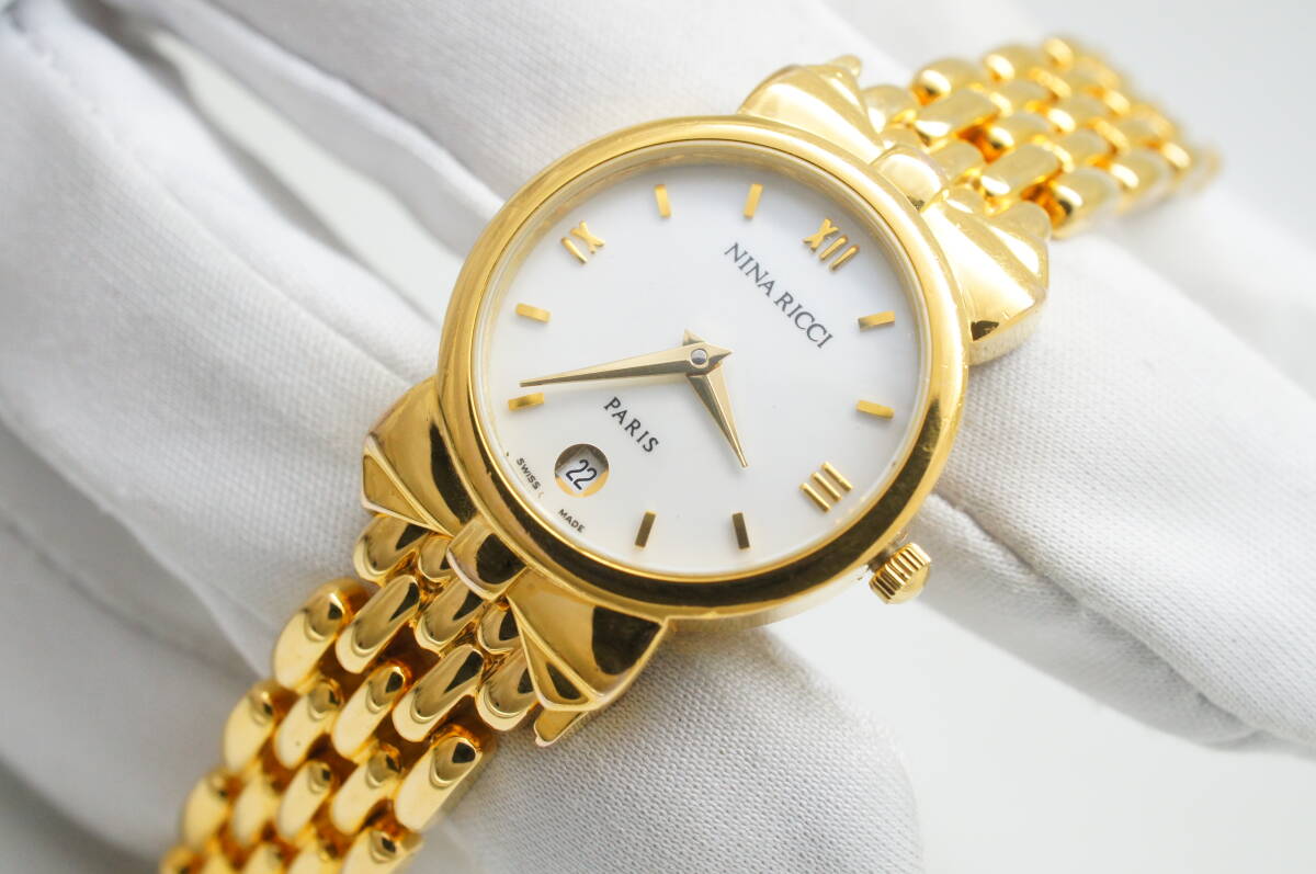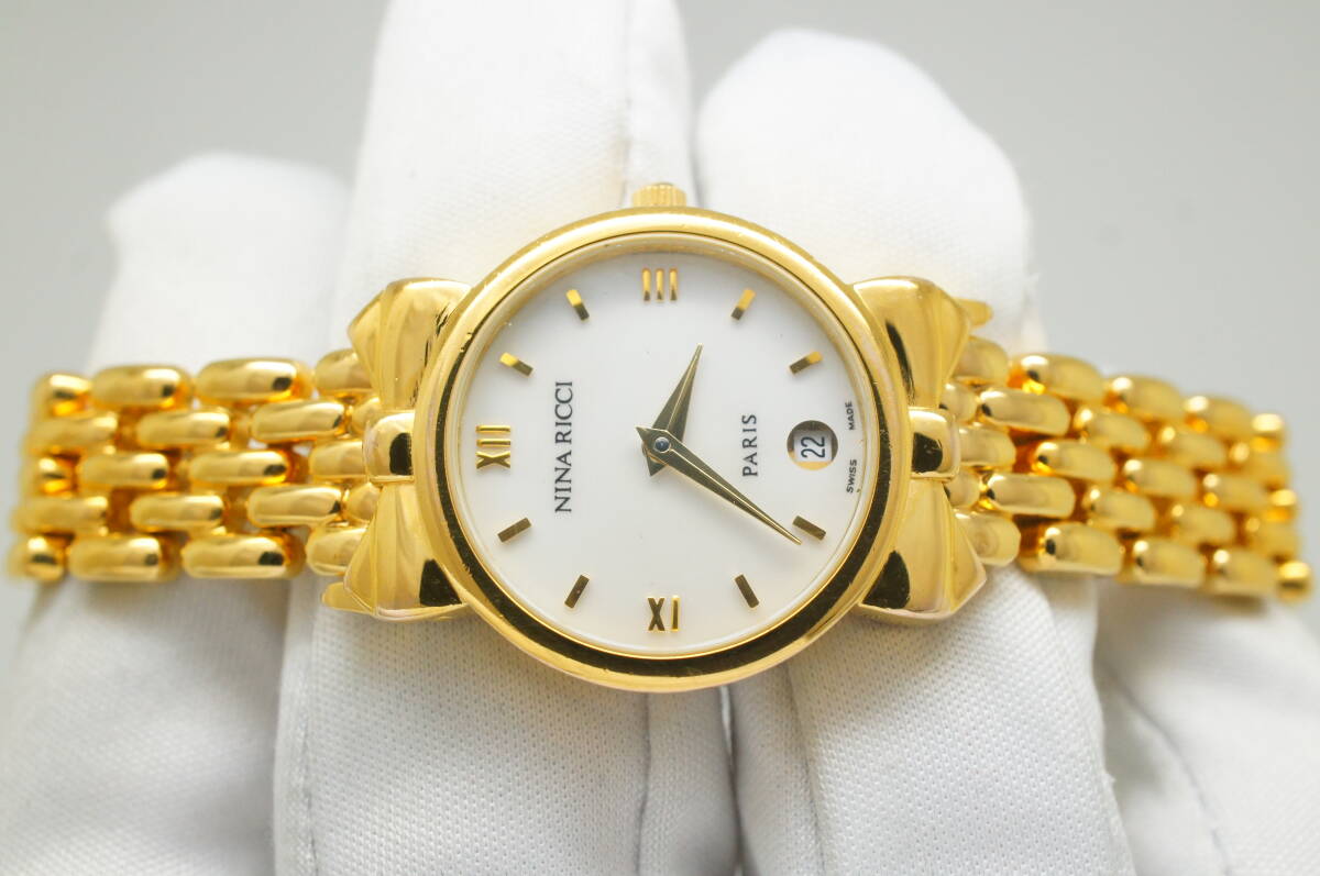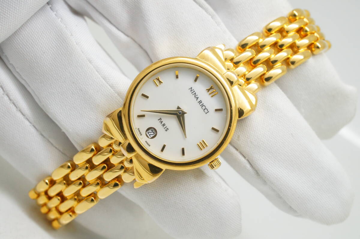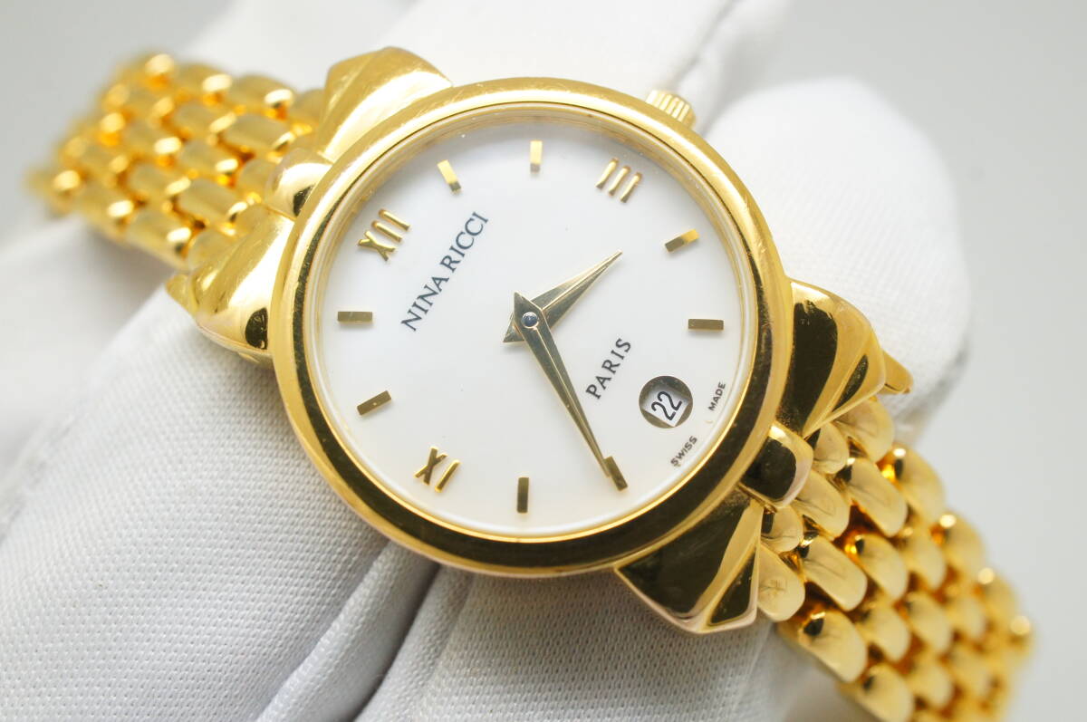 J190●作動良好 NINA RICCI ニナリッチ スイス製 SWISS MADE シェル文字盤 デイト レディース腕時計 ゴールド金 クォーツ