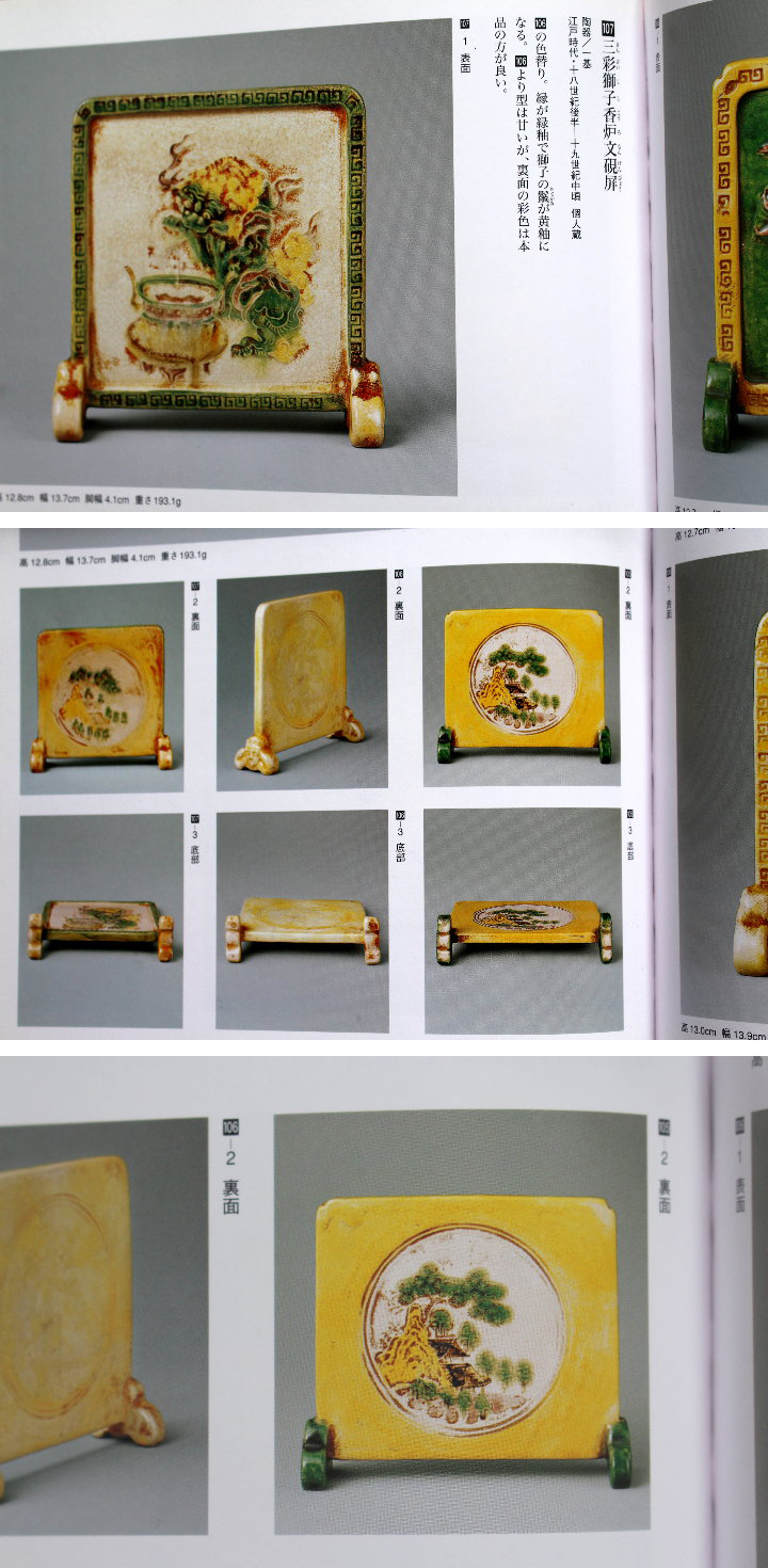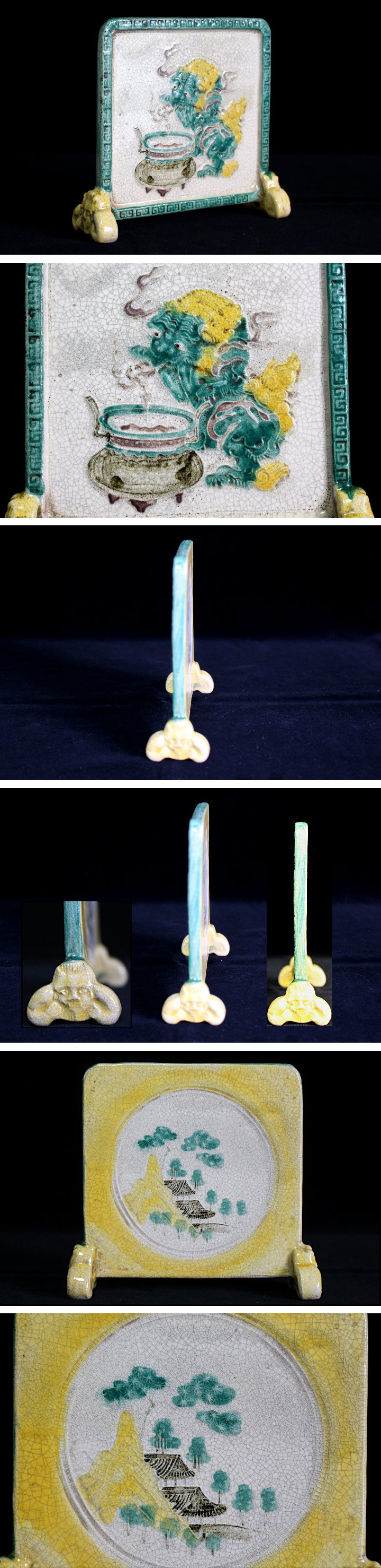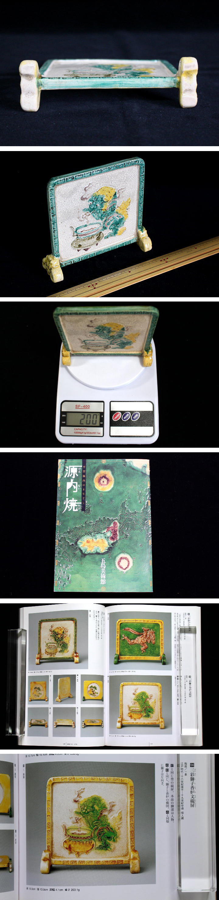 源内焼 三彩 獅子香炉文 硯屏です。 目立つ大きな傷みはありません。 図録 平賀源内のまなざし 源内焼(五島美術館) に同手の硯屏が掲載されています。 サイズは 高さ:12.8cm 幅 :13.9cm(12.2cm) 脚幅:4.1cm 重さ:200.0g ※ 図録は商品には含まれません。 写真をご覧の上ご入札宜しくお願い致します。 | |
