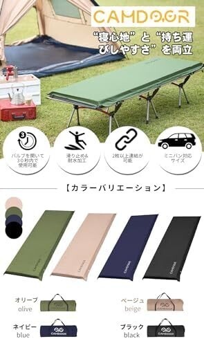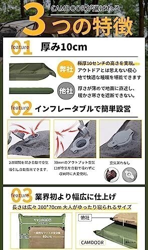 キャンプ マット エアーマット 厚手【30秒自動膨張・より広い】R値 6.8 インフレーターマット 車中泊マット コンパクト 自動膨張 キャンパー 無限連結可能 キャンプ用品 寝具エアーベッド 防水防潮 安全無臭 持ち運び便利 簡単収納 収納袋付き 商品詳細 3 つの利点: ①幅広のキャンプ マット:幅70cm(クッション幅65)。