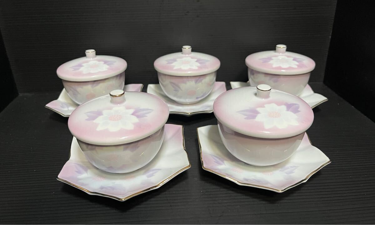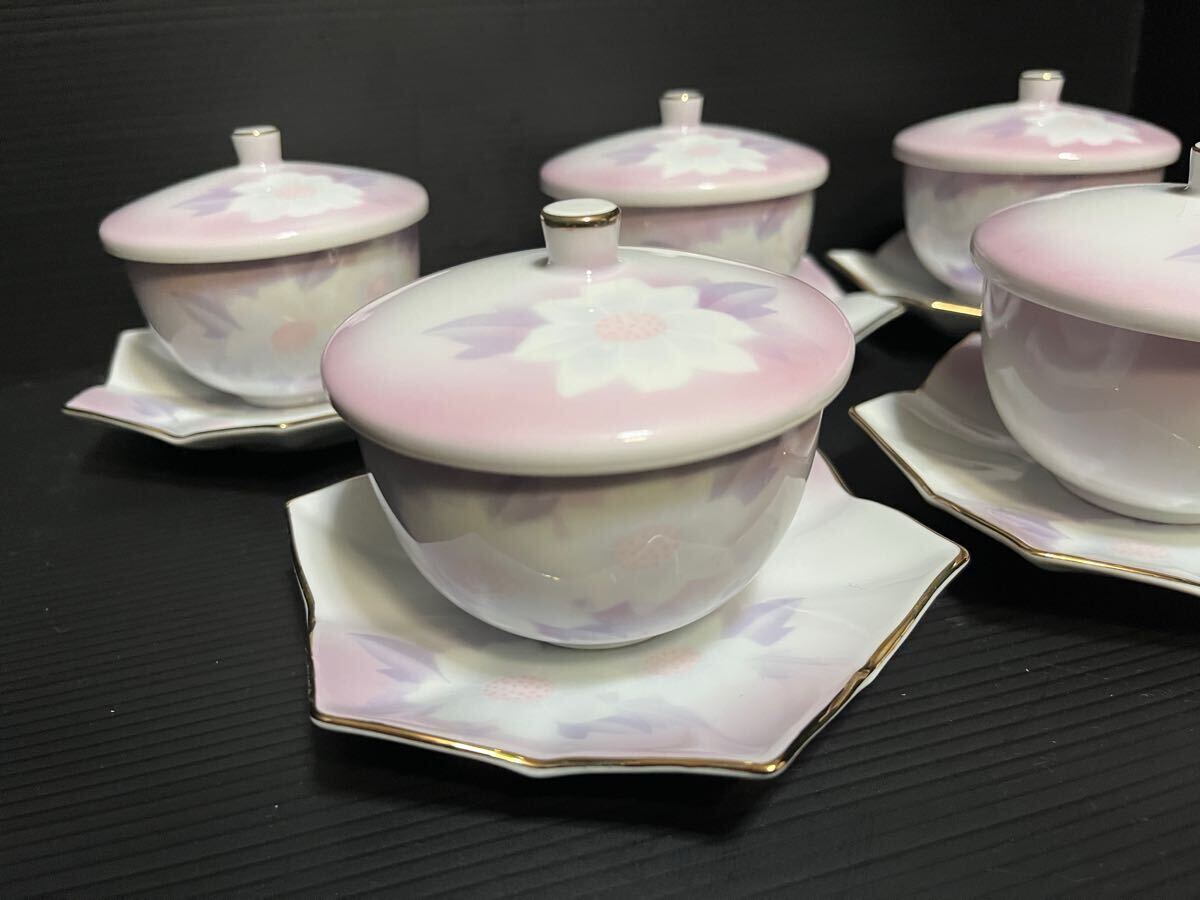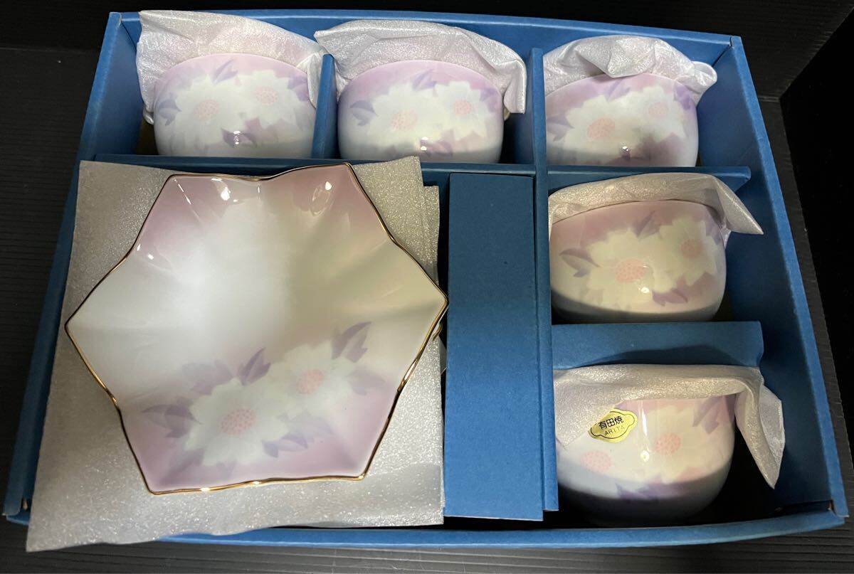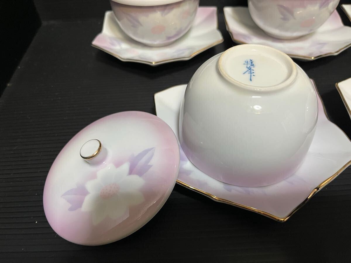 未使用 有田焼 雅峯 蓋付き湯呑 薄紫 5客セット